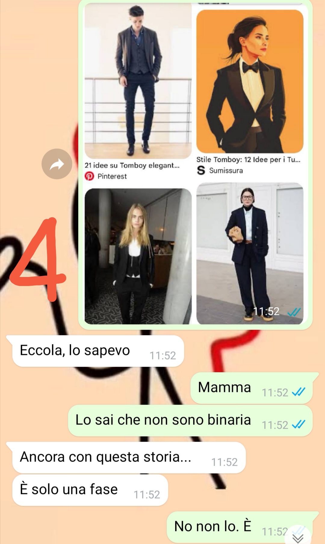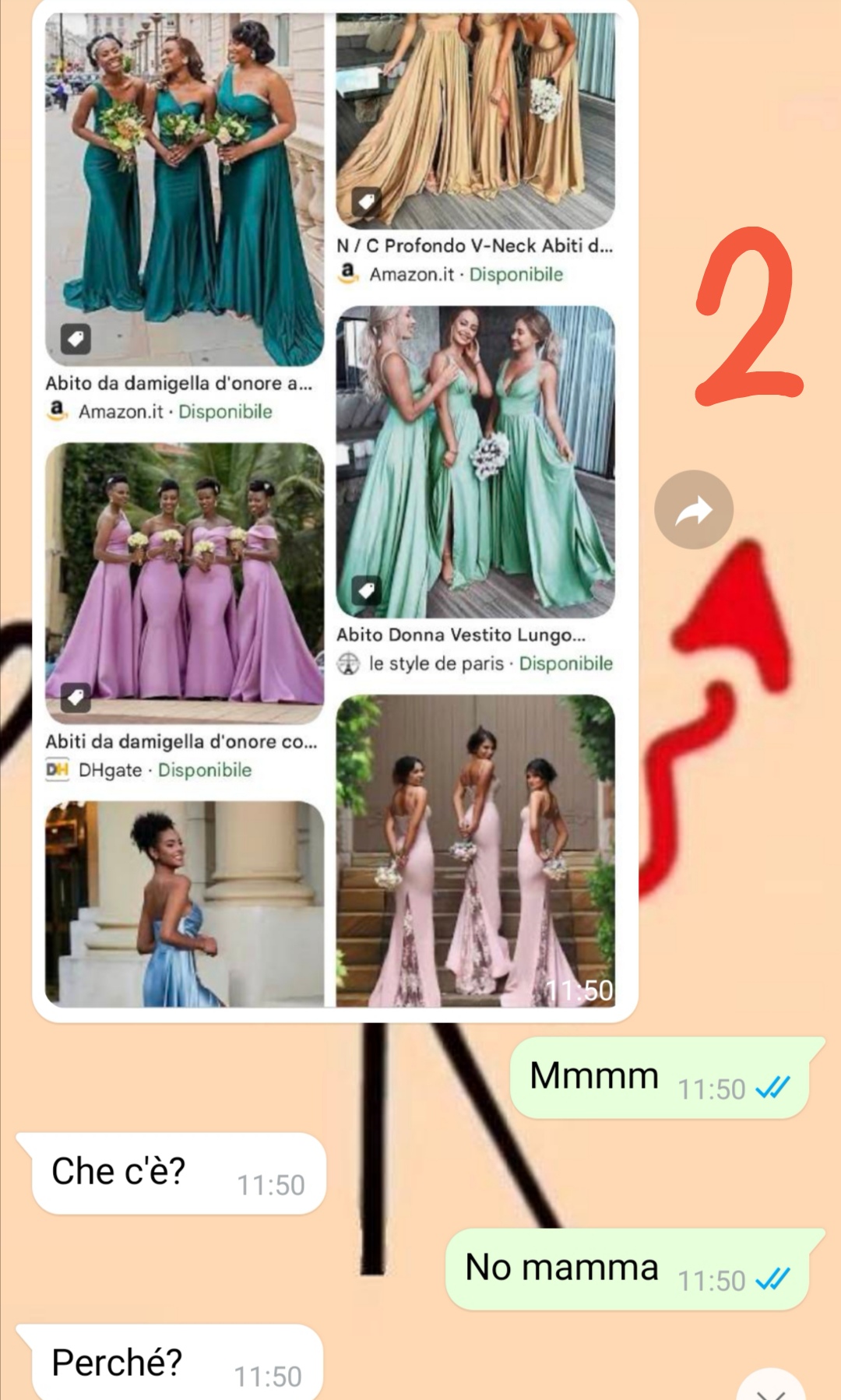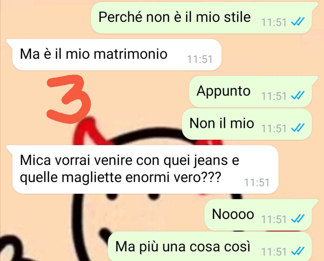 Vi mando una chat che ho avuto con mia mamma perché credo sia particolarmente importante condividere certi messaggi, specie nella società in cui viviamo.Cioè io ci tengo tanto.Mia mamma si sposerà a breve con il suo nuovo compagno e praticamente negli ultimi mesi non ha parlato d’altro. Mia mamma è una donna super-femminile, si trucca, si pettina e si veste bene anche per andare a buttare la spazzatura.Figuriamoci se per il giorno del suo matrimonio non avrebbe organizzato ogni secondo, desiderando che tutto fosse perfetto.E tra questa perfezione naturalmente dovrei rientrare anche io secondo lei. Infatti l’inizio della chat vede mia mamma impegnata a fare una ricerca per l’abito da damigella d’onore che avrei dovuto scegliere. Infatti quel pomeriggio era previsto che io, lei, mia zia e mia cugina Giada andassimo all’atelier per scegliere degli abiti coordinati.Io e mia mamma ne avevamo già parlato di questa cosa e sapeva benissimo cosa ne pensassi…ma ogni tanto mia mamma sembra soffrire di vuoti di memoria e allora io ho dovuto ricordarle un po’ di cose…