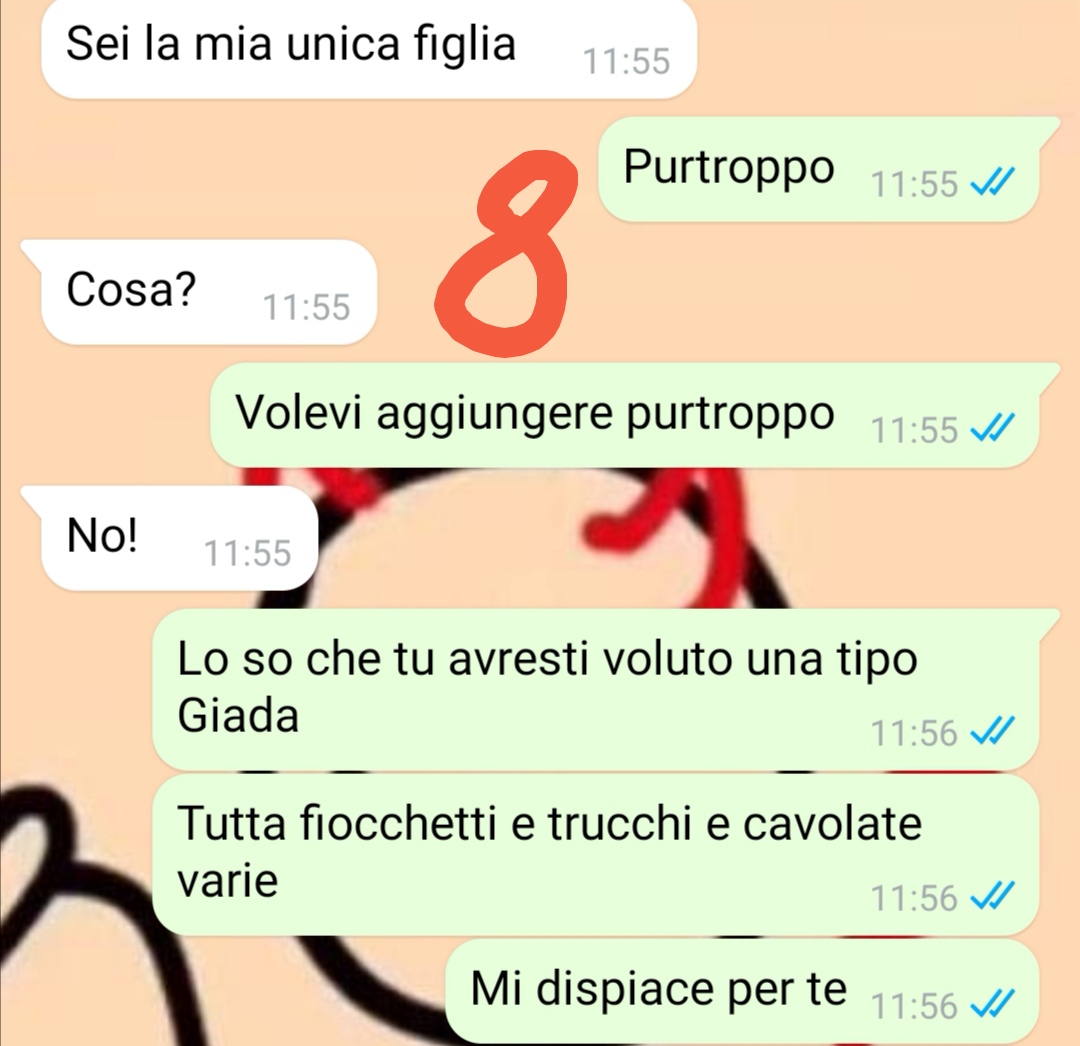 La nostra fan racconta una conversazione avuta con sua madre, una chat che ritiene importante condividere, soprattutto nel contesto della società attuale. Tiene molto a ciò che è emerso in quei messaggi e al significato che, secondo lei, meritano di avere. La sua mamma si sposerà a breve con il nuovo compagno e, negli ultimi mesi, non ha parlato praticamente d’altro. La nostra amica descrive la madre come una donna estremamente femminile, attenta all’aspetto in ogni situazione: si trucca, si pettina e si veste con cura anche solo per uscire a buttare la spazzatura. Di conseguenza, per il giorno del matrimonio, ha organizzato ogni dettaglio con precisione e desidera che tutto sia impeccabile.
