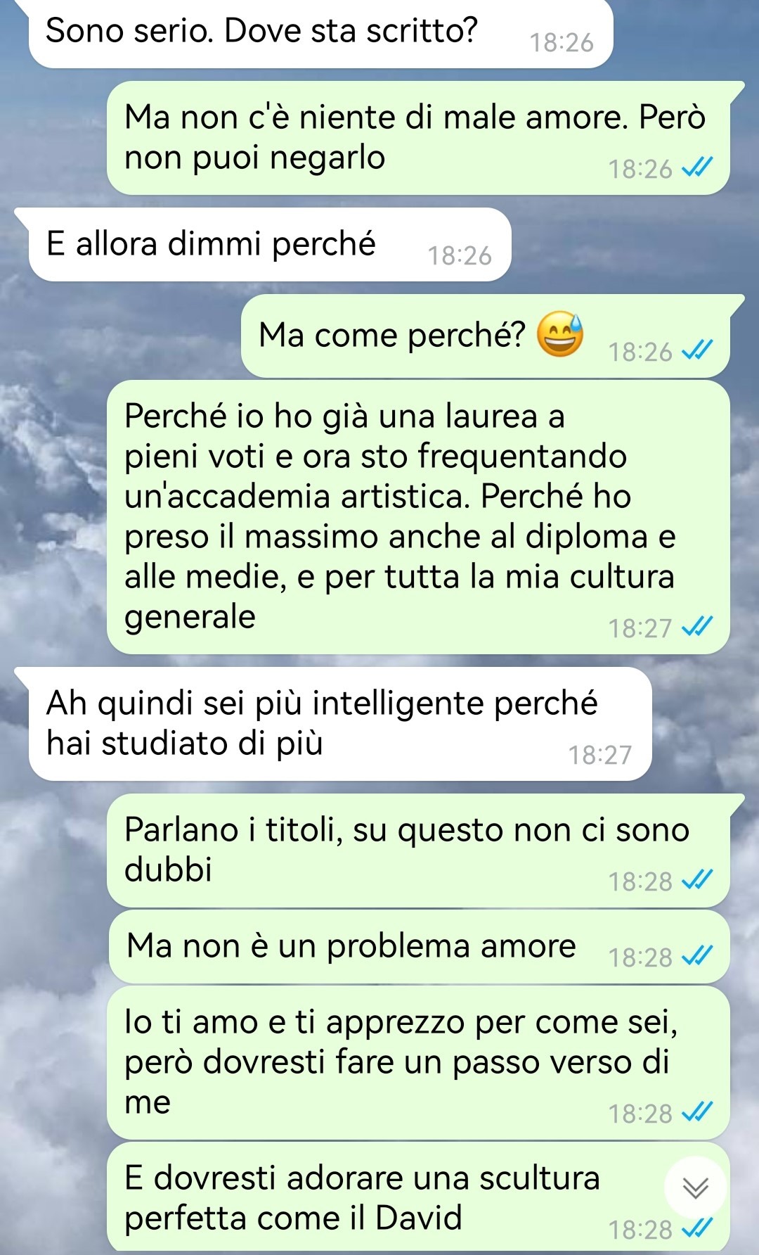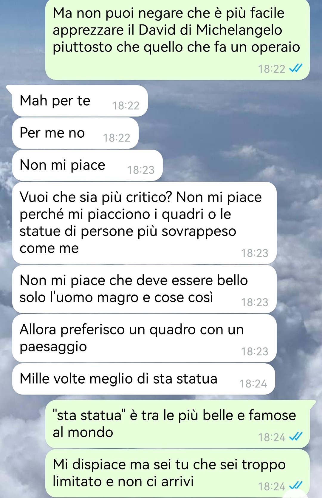 Il compagno, infatti, lavora come operaio e ha un background molto diverso dal suo. Questo di per sé non sarebbe un problema: la nostra fan non pretende certo che lui conosca la storia dell’arte o abbia una cultura accademica. Quello che le manca, però, è un minimo di curiosità, di voglia di comprendere ciò che lei ama, ciò che la entusiasma. Vorrebbe poter condividere almeno una parte del proprio mondo con lui, ma spesso si sente inascoltata, o peggio, fraintesa.