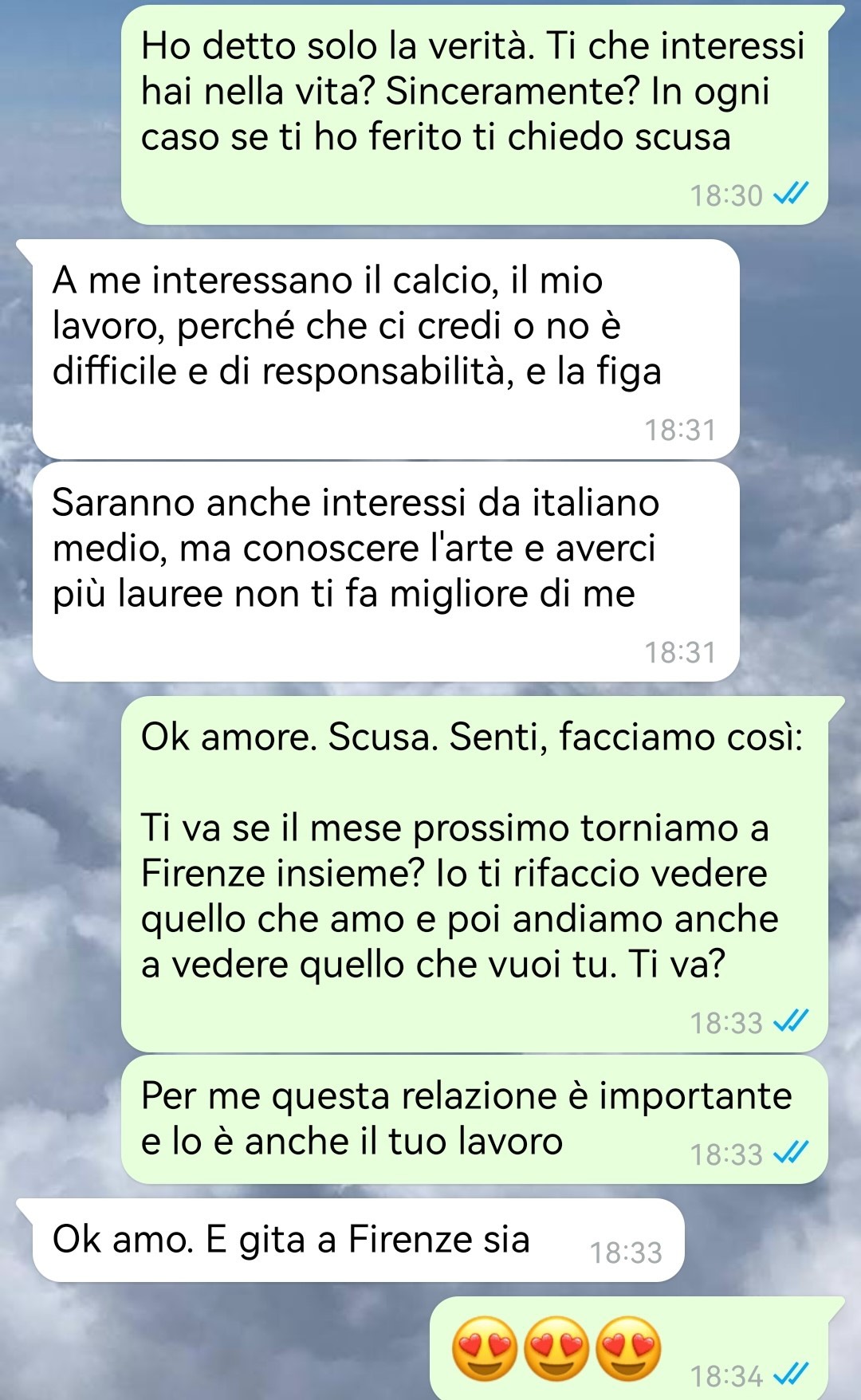 La chat che ha deciso di condividere con Commenti Memorabili racconta proprio questo momento di frattura. Una conversazione in cui emergono tutte le fragilità di una relazione lunga, ma che forse sta cambiando insieme a lei. Perché quando una persona cresce, cambia interessi, visioni, ambizioni… non sempre l’amore basta a tenere tutto insieme.