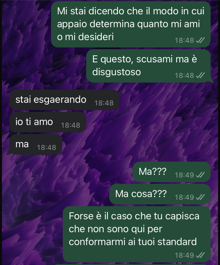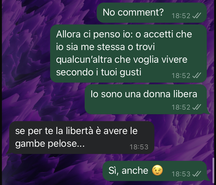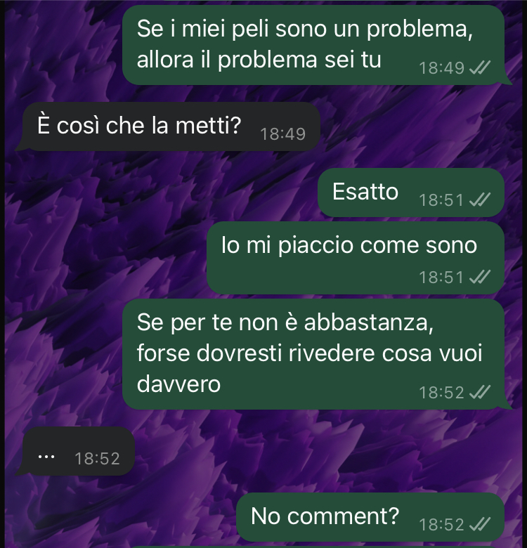 La nostra amica si è trovata a riflettere su questioni più ampie che vanno oltre la loro relazione di coppia, interrogandosi sulla libertà femminile di decidere del proprio corpo e sull’influenza che le imposizioni estetiche della società possono avere anche nell’intimità di una coppia. Flavia sottolinea come per lei sia fondamentale guardare all’interiorità delle persone piuttosto che al loro aspetto esteriore, soprattutto nelle relazioni serie e durature, e ha condiviso gli screenshot della conversazione chiedendo il parere della community di Commenti Memorabili.