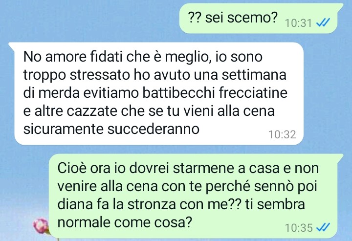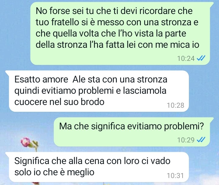 mi chiamo Serena e vi farò leggere una cosa vergognosa che penso si commenti per tutti da sola. Sto con un idiota da circa un anno, il suo nome è Paolo e lui ha un rapporto molto stretto e bello con suo fratello Alessandro. Questa chiaramente è una cosa positiva, non fraintendete, il problema però nasce quando io vengo a scoprire dei pensieri umilianti ed incommentabili che Paolo farebbe su di me e sulla compagna di suo fratello Alessandro.. tale Diana, che io tra l’altro ho pure visto mezza volta in vita mia anche se tra noi è successo quello che è successo. Leggete la chat che ho inviato e ditemi cosa ne pensate perché io ho finito davvero le parole per il disprezzo e lo schifo della situazione. Si tratta di qualcosa di veramente inaccettabile e degradante per me come persona.
