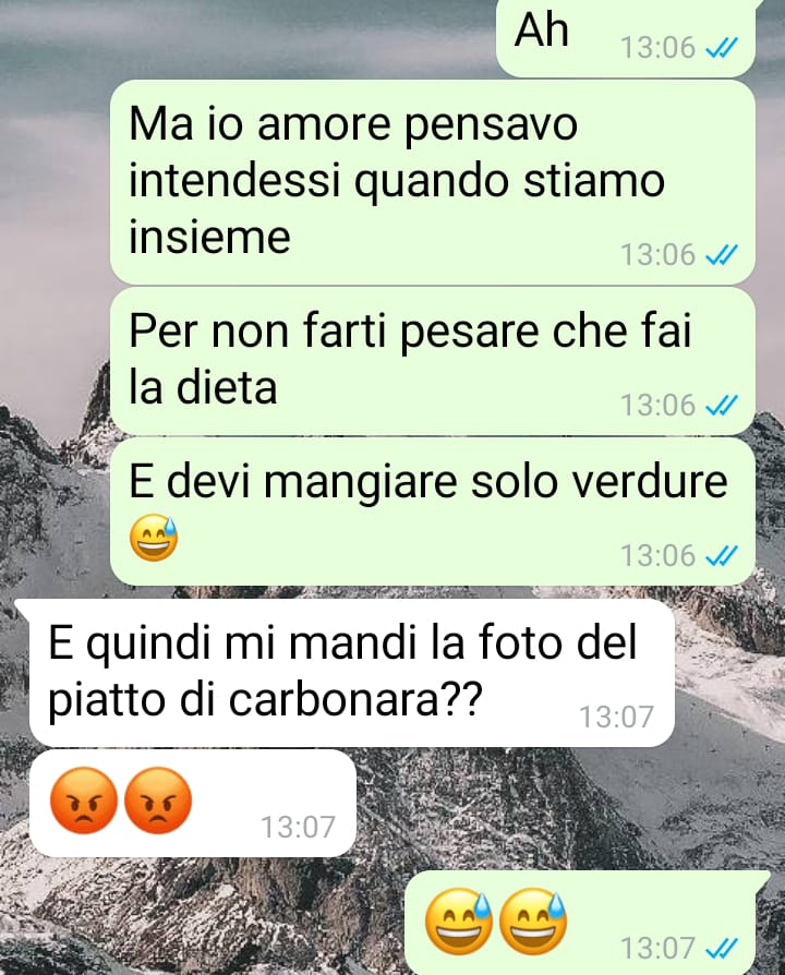 Il nostro fan, Giuseppe, racconta di trovarsi in un momento di forte tensione a causa di un litigio recente con la sua ragazza. Dopo un anno e mezzo di relazione serena, caratterizzata anche da una passione condivisa per il cibo e i momenti conviviali, la situazione è cambiata improvvisamente quando lei ha deciso di iniziare una dieta per motivi personali.