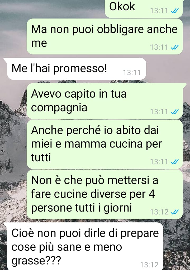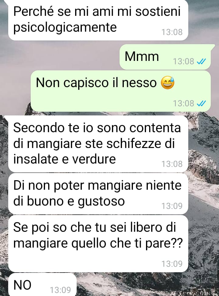 Fino a quel momento, non erano mai mancate uscite a pranzo o a cena, partecipazioni agli street food cittadini e serate dedicate a pizza e film. Per questo motivo, il giorno in cui la sua ragazza ha iniziato la dieta, Giuseppe è rimasto sorpreso quando lei gli ha inviato la foto dell’insalata che si era preparata. Con l’intento di strapparle un sorriso, ha deciso di rispondere inviandole a sua volta la foto del piatto che stava mangiando in quel momento.