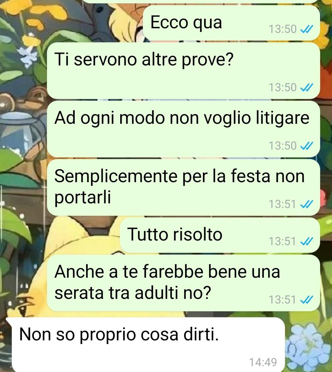 Il giorno dell’aperitivo, però, la situazione è precipitata. Carola, invitata come molti altri amici, si è presentata accompagnata dai propri figli. Debora racconta che non avrebbe avuto nulla in contrario alla loro presenza, se la madre si fosse mostrata attenta e li avesse controllati. Al contrario, spiega che Carola tende a lasciarli completamente liberi di fare ciò che vogliono, senza mai rimproverarli o richiamarli, cosa che li rende difficili da gestire, soprattutto in una casa piena di oggetti delicati.