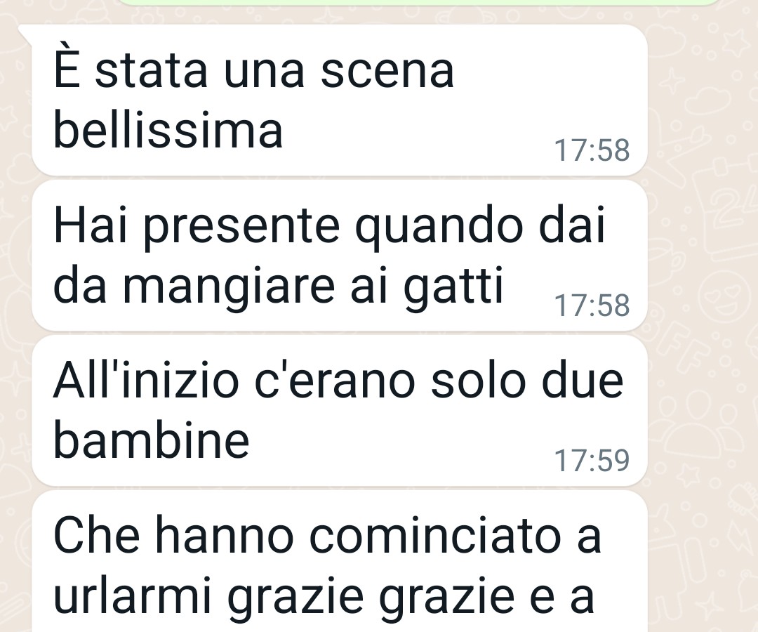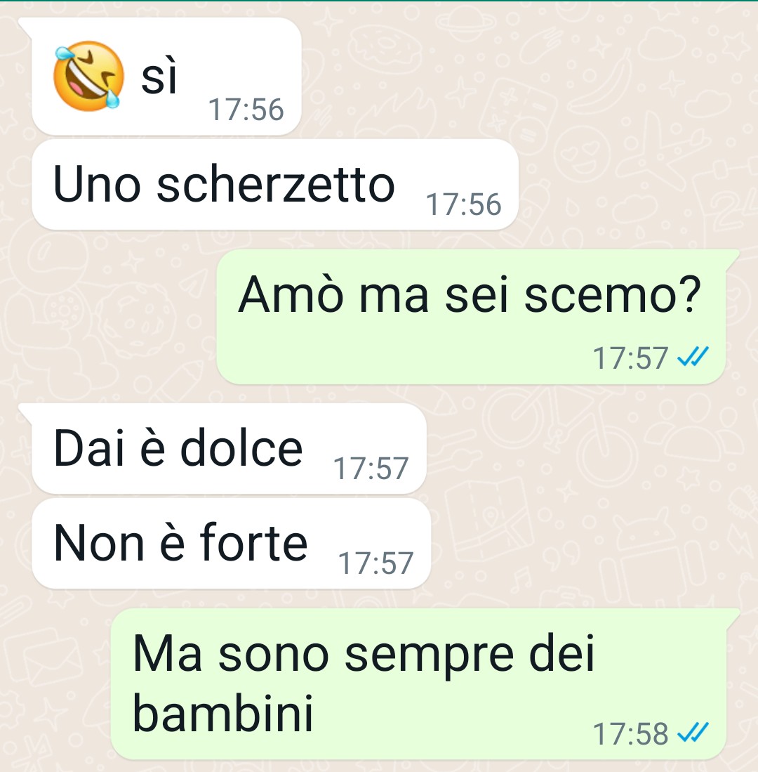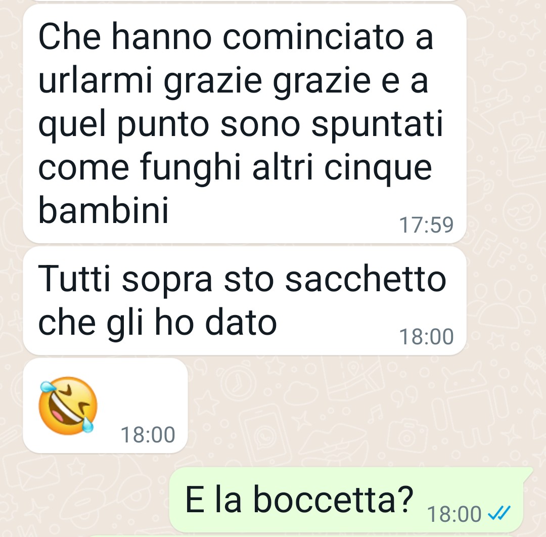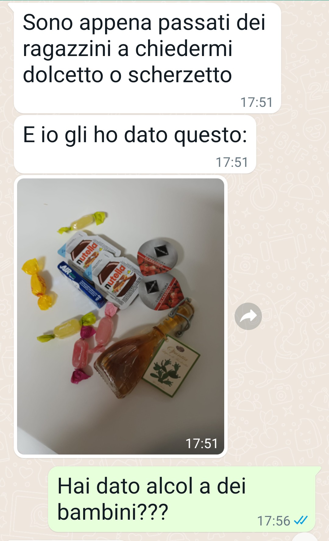“Ciao Commenti Memorabili, sono Ambra e ho un ragazzo idiota, talmente idiota che ha dato dell’alcol a dei bambini. Avete presente l’usanza dolcetto o scherzetto, no? Anche da noi in Italia sta prendendo piede e gruppi di ragazzini girano, anche nei paesi, a chiedere dolcetti. Io ero fuori per lavoro e suonano al mio citofono dei ragazzini. Il mio compagno va ad aprire. Era tutto emozionato, mi ha detto che era la prima volta che gli capitava in vita sua. Si è decisamente confuso. Ecco cosa ha combinato. Vi mando la chat perché certe imprese così memorabili e ignoranti vanno condivise. È un dovere verso il mondo… forse.. Il mio compagno non è un tipo che ci sa fare con i bambini. Ci prova, a suo modo. Non ha fratelli, non ha nipoti e non sa come comportarsi. È una persona buonissima, ma al tempo stesso non si rende esattamente conto di quello che fa. È abituato alla sua comitiva di amici maschi, un circolo privato raffinatissimo dove si rutta per dire ti voglio bene e si brinda col vino buono del supermercato.”