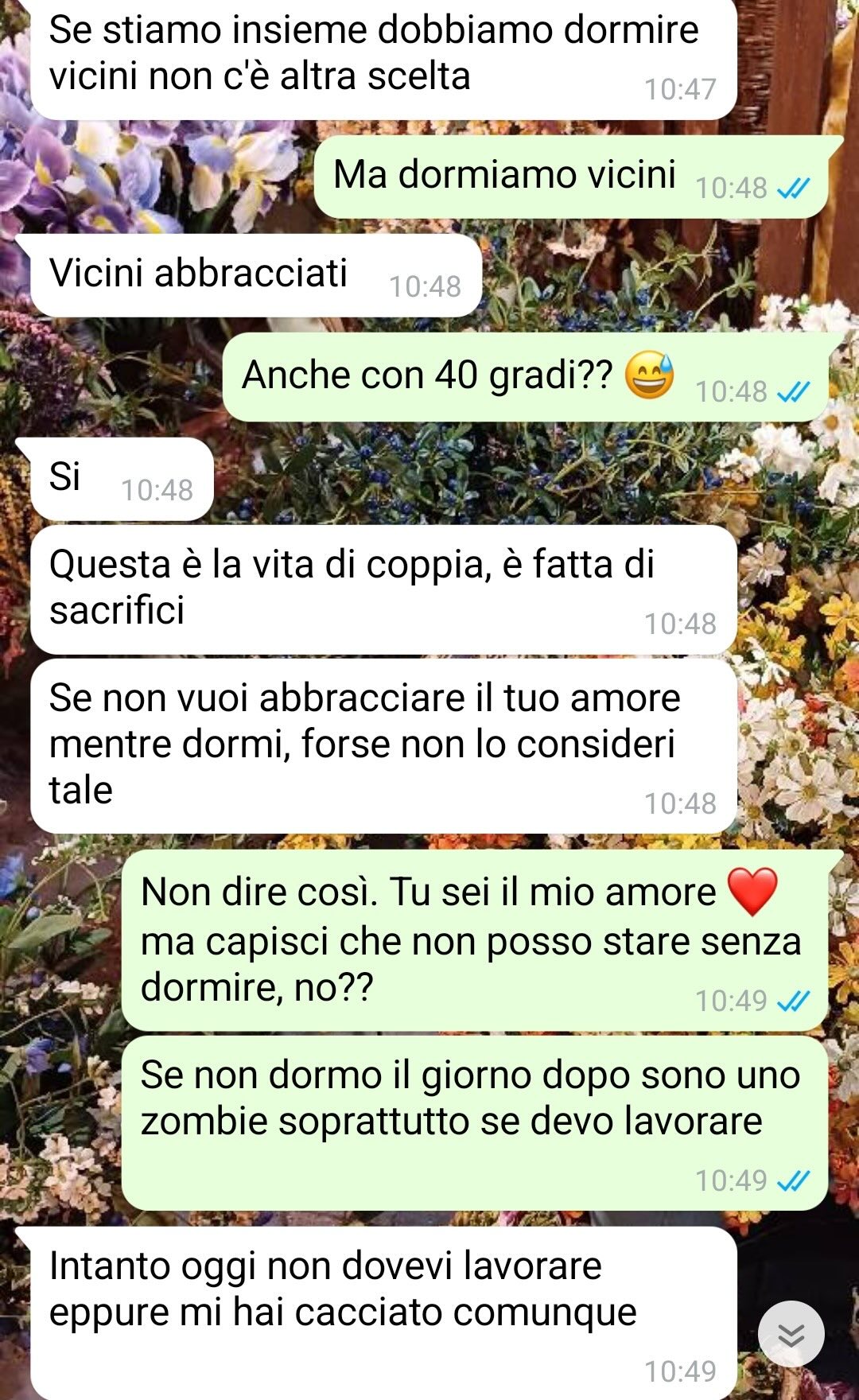 Sto con Piero ormai da due anni ma sono solamente 4 mesi circa che viviamo insieme. Quindi praticamente abbiamo iniziato la convivenza poco prima che iniziasse l’estate, quando, fortunatamente, le temperature erano ancora accettabili e non c’era questo caldo torrido. Tutto andava bene fino a che ho avuto una discussione con il mio ragazzo che mi ha fatto riflettere. Tutto è iniziato perché voleva dormire abbracciati, come facciamo spesso. Ma in estate ovviamente c’è un problema: fa troppo caldo. Se stiamo vicini passo la notte a sudare e girarmi senza trovare pace. Così quando fa troppo caldo sguscio dal suo abbraccio per cercare un po’ di fresco sull’altro lato del letto. Lui però ci è rimasto male. Mi ha accusato di non tenerci abbastanza a lui, di mettere il comfort prima del nostro rapporto. Mi chiedo: è giusto sacrificare il sonno per stare vicini? O è più importante dormire bene per affrontare la giornata? Abbraccio o sonno? Non ci capisco più niente. Certo è che la sua reazione e il modo in cui si è comportato mi ha lasciato di stucco.