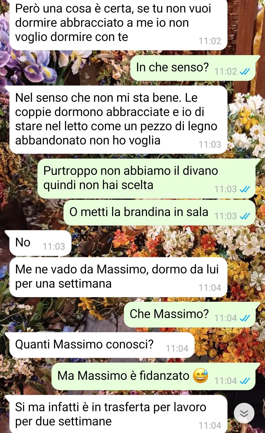 Secondo il racconto della nostra fan, questo comportamento non è stato accolto bene dal ragazzo. Piero, infatti, si sarebbe risentito per il fatto che lei si allontanasse durante la notte. L’amica riferisce che lui le ha espresso il suo dispiacere, interpretando quel gesto come una mancanza di attenzione o di affetto nei suoi confronti. Nel corso della discussione, lui l’avrebbe accusata di dare più importanza al proprio comfort che al rapporto di coppia.