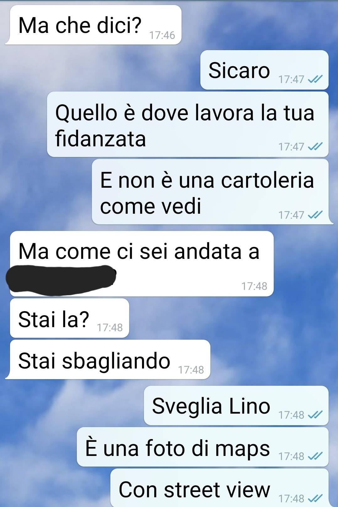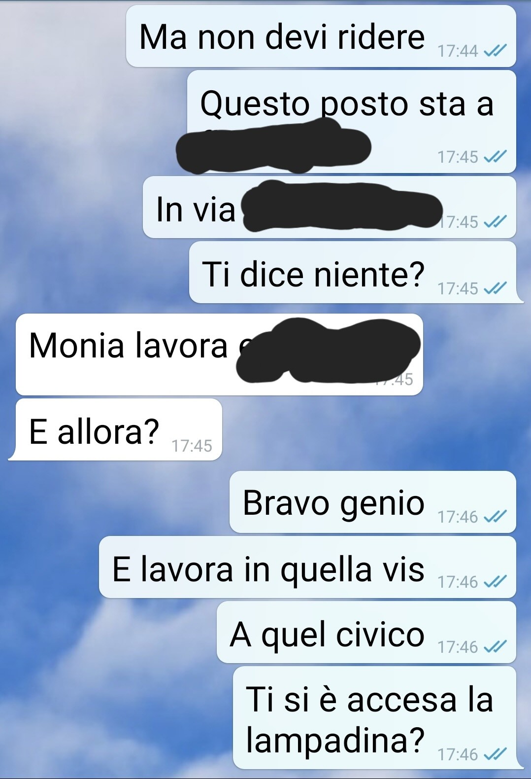 “Io sono Annamaria, quella che mi manda questa chat. Mio fratello si chiama Lino ed è quello che mi risponde in questa chat. Poi c’è Cinzia, la fidanzata di Lino, che non scrive niente qui ma è la protagonista della storia. Si è messa con mio fratello l’estate scorsa, a me è sempre sembrata poco affidabile, una con la puzza sotto al naso. Ma queste sono miei impressioni, non valgono niente. Ora però c’è un però. Da 3 mesi si è trasferita in un’altra regione per lavoro. Ho notato che spende, e quindi guadagna, troppo per una che lavora in cartoleria (o cartolibreria, ogni volta usa parole diverse, e questo mi ha pure insospettita). Quindi indago un po’ e quello che scopro lo dico subito a Lino. A un certo momento non sapevo se ero più incazzata con lei o con lui. Perché lei stronza ok, ma lui così deficiente non me lo aspettavo.”