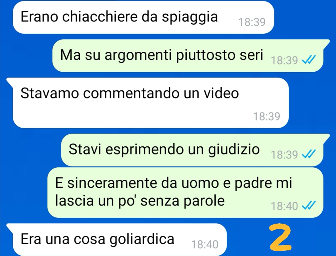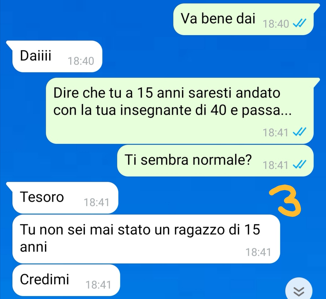 Ho deciso di inviarvi questa conversazione avvenuta con mio marito qualche giorno fa mentre eravamo in vacanza, perché credo sia importante portare alla luce certi temi. In spiaggia a un certo punto, insieme a un gruppo di persone conosciute lì, comincia a girare il video dell’intervista all’insegnante di Bari che aveva abitualmente rapporti intimi con 15enni. Non so se avete sentito. Tutti gli uomini presenti compreso mio marito, purtroppo, cominciano a ridere e dire che loro insegnanti così non le avevano e magari le avessero avute… La cosa mi infastidisce parecchio, perché io invece, da donna adulta, credo sia una cosa da punire legalmente… Per non sentire oltre e dato che sembravo l’unica a vederne la gravità, lascio il gruppo e vado in albergo senza dire nulla. Dopo un po’ mio marito si accorge che non ci sono e mi manda un messaggio. Ovviamente prosegue la discussione cominciata in spiaggia… Con l’aggiunta di un particolare… Una cosa che credo sia arrivato il momento di confessargli…