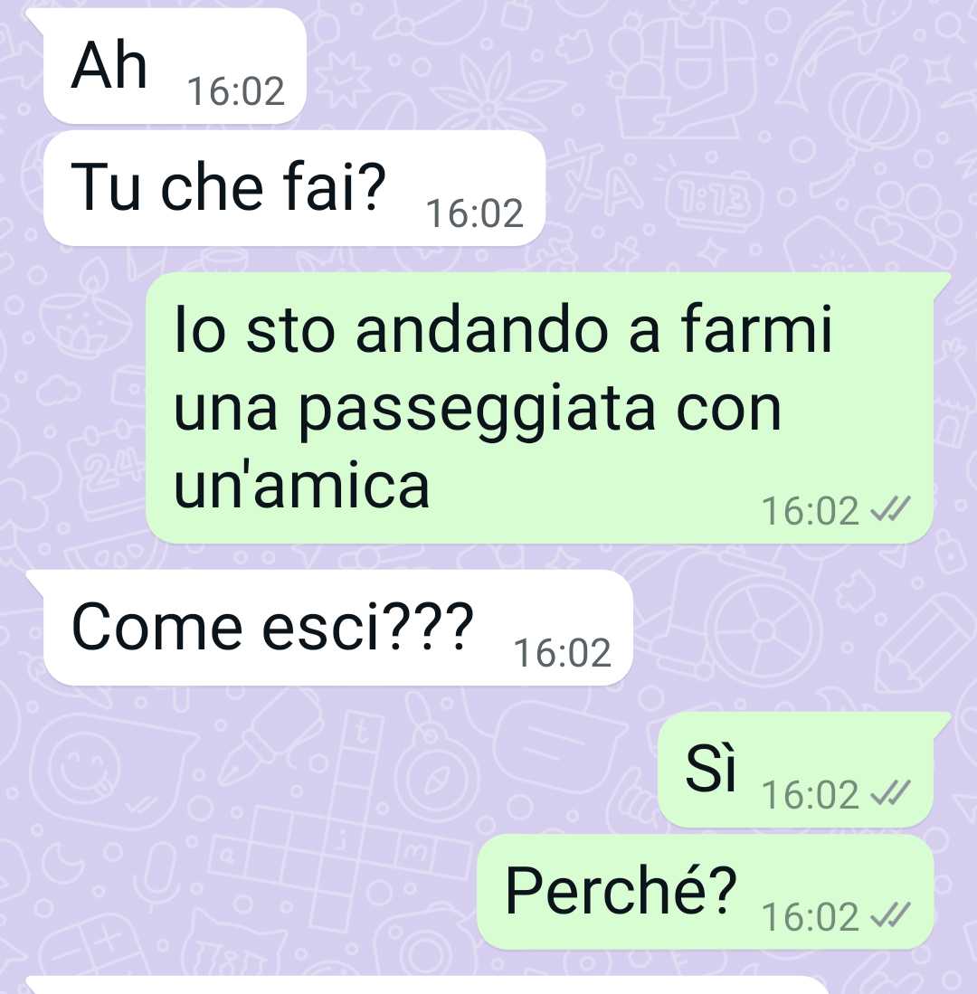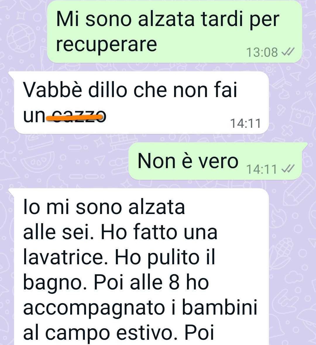 Vivo con mia madre che sta male. Mi prendo cura di lei ma mia sorella sos5ene che non faccio niente. Non è facile lavorare, spaccarsi la schiena assistendo un genitore e poi sen5rsi dire che in realtà non si fa niente. Lo sapete questo come si chiama: senso di colpa. Sì mia sorella prova un senso di colpa enorme per mia madre. Perchéé?? Perchhe lei non c’è mai, perché lei non ce la fa, perché lei da la priorità a tutte le cose belle della sua vita e forse per ul5mo a nostra madre. lei il suo senso di colpa lo rifiuta e lo butta addosso a me. A me che mi spacco la schiena, a me che sto con mia mamma giorno e note. Leggetevi la chat e sono sicura che mi darete ragione. Il problema è che sono stanca. Sono così stanca che non ho neanche la forza di arrabbiarmi con lei, di li5gare con lei. Non ce la faccio. Per questo vi ho scritto per trovare sostegno. Scusate se forse questo non è il posto ggiusto. Ma sono stanca e siete i primi che mi siete venu5 in mente.