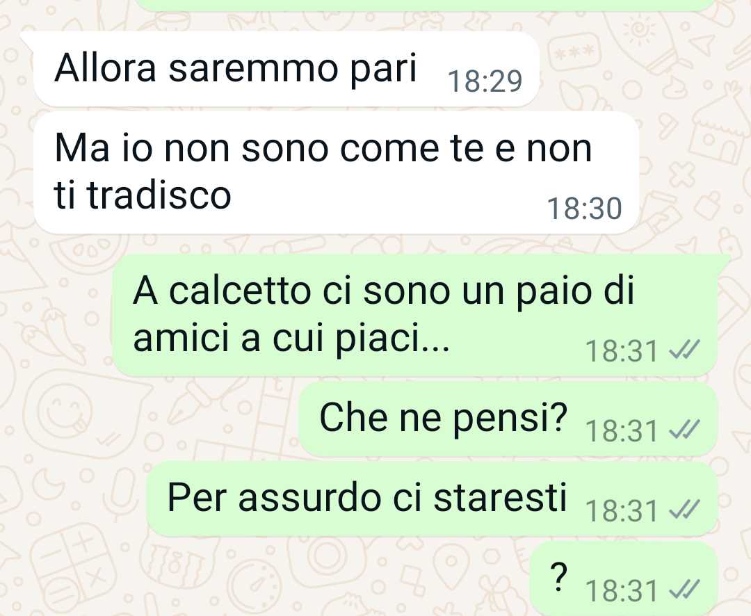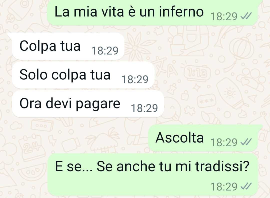 Il racconto che ha voluto condividere, attraverso messaggi e screenshot, mostra una dinamica relazionale complessa, fatta di colpe, perdono e tentativi estremi di riscatto.