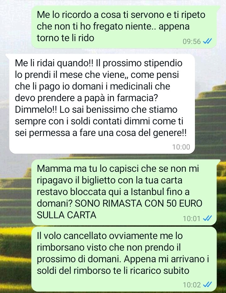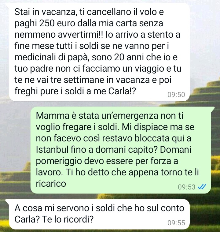 Mi chiamo Carla e ho scoperto di essere un’orfana di fatto.. o meglio, credevo di avere una famiglia che mi volesse bene e si prendesse cura di me nel momento del bisogno e delle varie e molteplici emergenze e sfide che la vita ti para davanti, ma evidentemente ho fatto male i calcoli. Leggete questa conversazione che vi ho inviato e rendetevi conto da soli di che razza di madre mi è capitata al mondo. Una che da risposte simili alla propria figlia in un momento del genere voi me la chiamate davvero una madre reale? Leggere per credere! Robe da scandalo proprio..