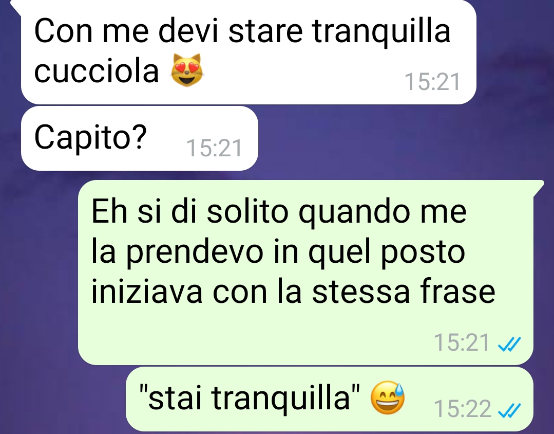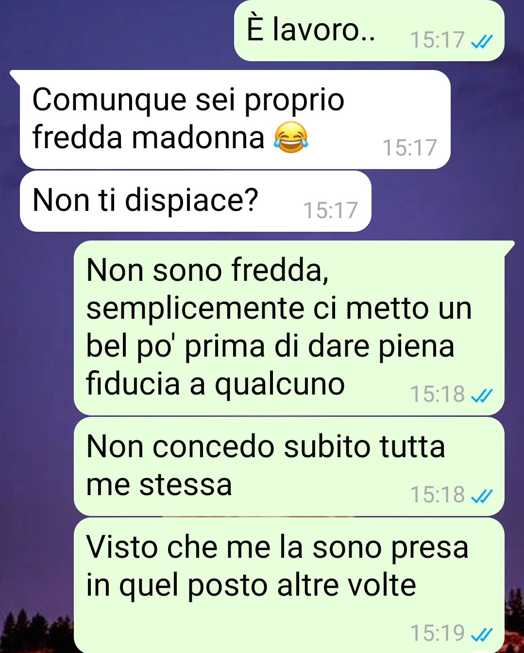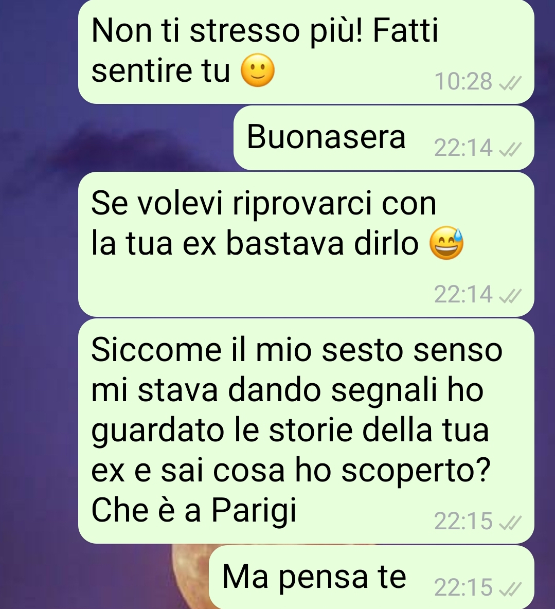 Nonostante questi propositi, la nostra fan racconta che la situazione si è ripresentata. Ha conosciuto Enrico, il ragazzo protagonista della chat che ha deciso di condividere, e con lui ha iniziato una frequentazione durata quasi tre mesi. La nostra amica precisa che il loro rapporto era una via di mezzo tra lo “stare insieme” e il semplice frequentarsi, ma che comunque aveva assunto una certa importanza nella sua quotidianità.