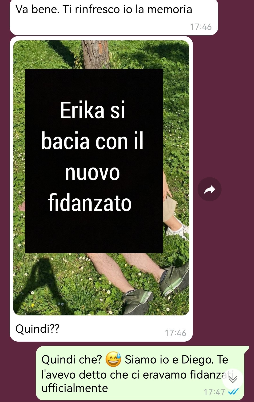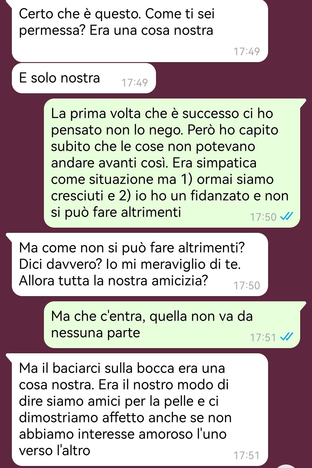 Sono all’interno di una situazione estremamente spinosa. Ogni passo che faccio in avanti me ne fa poi fare tre indietro, e al tempo stesso ho una paura enorme di deludere tutti. Mi chiamo Erika, ho 24 anni e da qualche settimana sono ufficialmente fidanzata con Diego, un ragazzo che già conoscevo ma che non avevo mai considerato in questo senso, e con il quale invece mi sto trovando bene dato che si è rivelato molto dolce e molto simpatico. Il problema, se così si può chiamare perché appunto non voglio essere cattiva né offendere nessuno, è il mio migliore amico Riccardo. Noi ci conosciamo da quando eravamo in fasce, siamo cresciuti insieme, e tra noi c’è un rapporto di amicizia vera, solida e con fondamenta indistruttibili, nonostante i nostri diversi caratteri. Lui era anche contento della notizia di Diego e infatti nei primi giorni non ci sono stati problemi. Il problema è sorto quando io ho pubblicato una foto con Diego in cui faccio una cosa che ero abituata a fare, in un certo modo e con un certo significato, con Riccardo. E lì è davvero successo il finimondo.