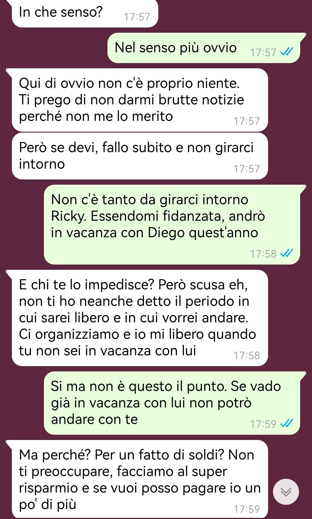 Una nostra fan di nome Erika ha raccontato una situazione che, come lei stessa spiega, si è fatta molto complicata e le sta creando non pochi turbamenti. L’amica ha 24 anni e da qualche settimana ha iniziato una relazione con un ragazzo di nome Diego, una persona che conosceva già da tempo ma che non aveva mai considerato in modo sentimentale. Racconta che, con il passare dei giorni, ha scoperto in lui un carattere dolce e simpatico, e che la relazione, almeno in apparenza, sta andando bene.