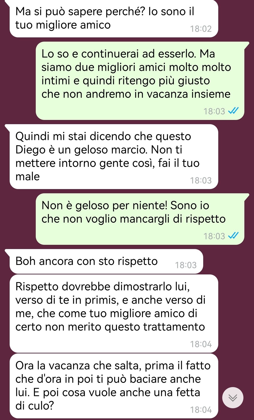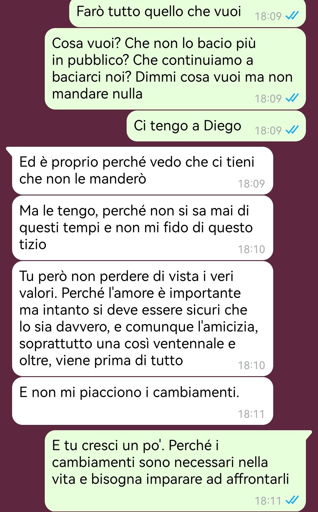 Erika scrive di trovarsi in mezzo a due affetti importanti: da un lato il legame appena nato con Diego, dall’altro l’amicizia di una vita con Riccardo. Ogni passo che fa, dice, sembra farla tornare indietro di tre. Ha paura di deludere entrambi e di perdere qualcosa di prezioso qualunque scelta faccia. Racconta di sentirsi bloccata, confusa e ferita da una situazione che non avrebbe mai immaginato potesse degenerare in questo modo.