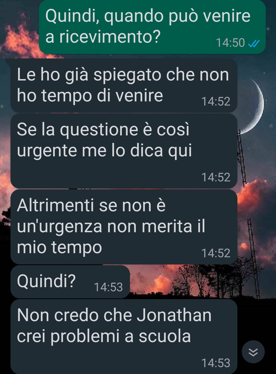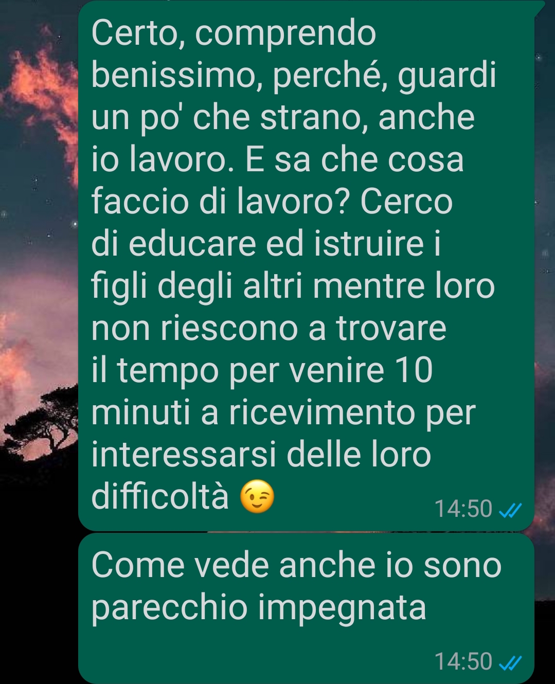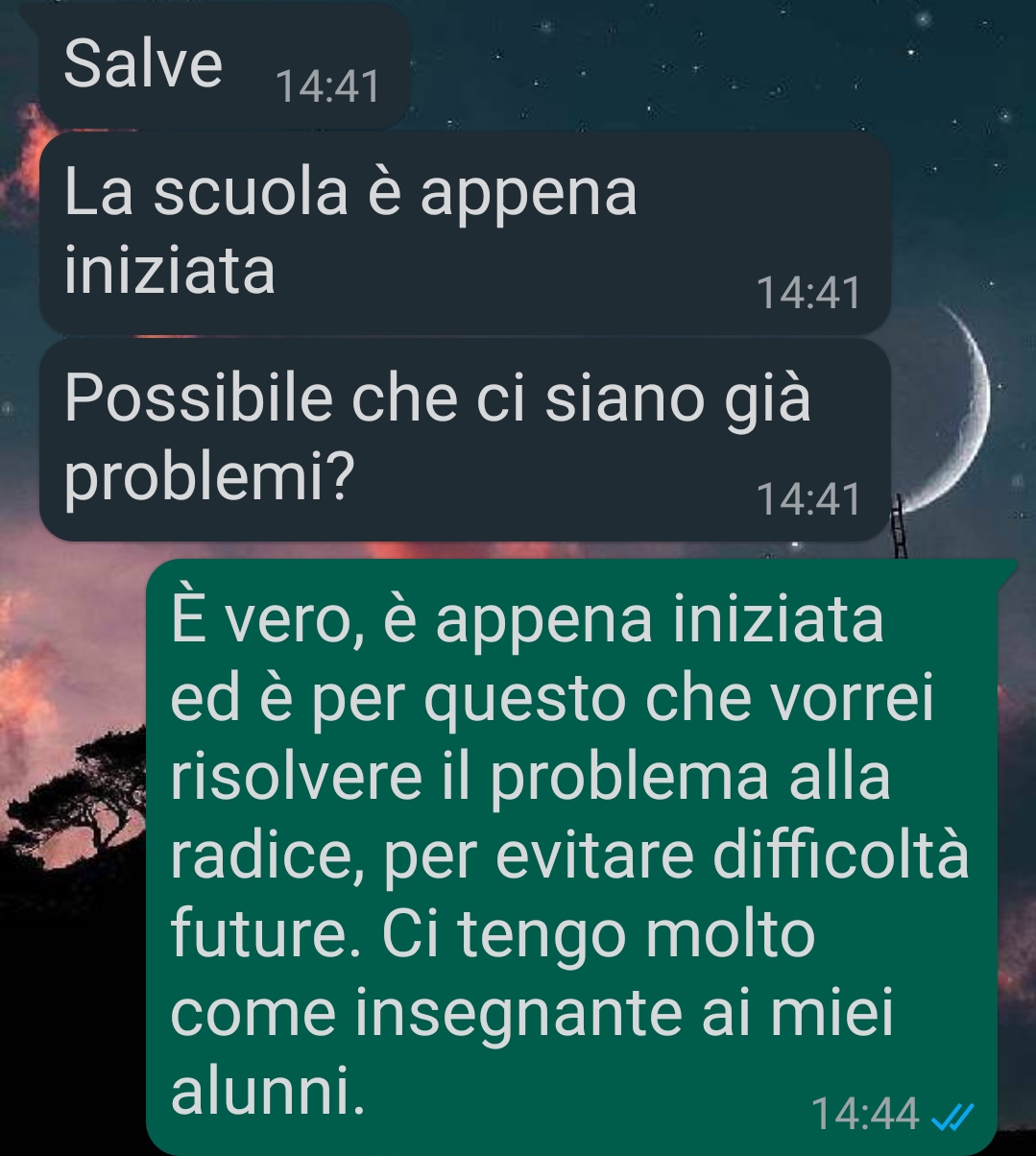 Il mio nome è Clizia, ho 28 anni e sono una maestra di matematica alle elementari. Ormai lavoro in questo settore da due anni e mi ritengo molto fortunata ad aver ottenuto il posto così “presto”, molti miei colleghi ci impiegano anni e anni. Io so di essere destinata a fare questo lavoro, perché adoro i bambini, mi piace insegnare e sono cresciuta con entrambi i miei genitori professori delle superiori. Sono cresciuta circondata dalla loro passione per la loro professione, dall’amore verso i ragazzi e dall’importanza del lasciare un segno nelle loro menti e nei loro cuori. Infatti, questa cosa me la sono portata dietro anche io, tant’è che scrivo al papà di un mio nuovo alunno per parlargli delle difficoltà di suo figlio. Io sono dell’idea che i problemi vadano affrontati fin da subito, ma purtroppo al giorno d’oggi, nel 202 4, non ci sono più i genitori di una volta. Vi mando qui sotto la conversazione, per darvi un’idea di cosa voglia dire essere maestra oggi. Vi auguro una buona giornata!