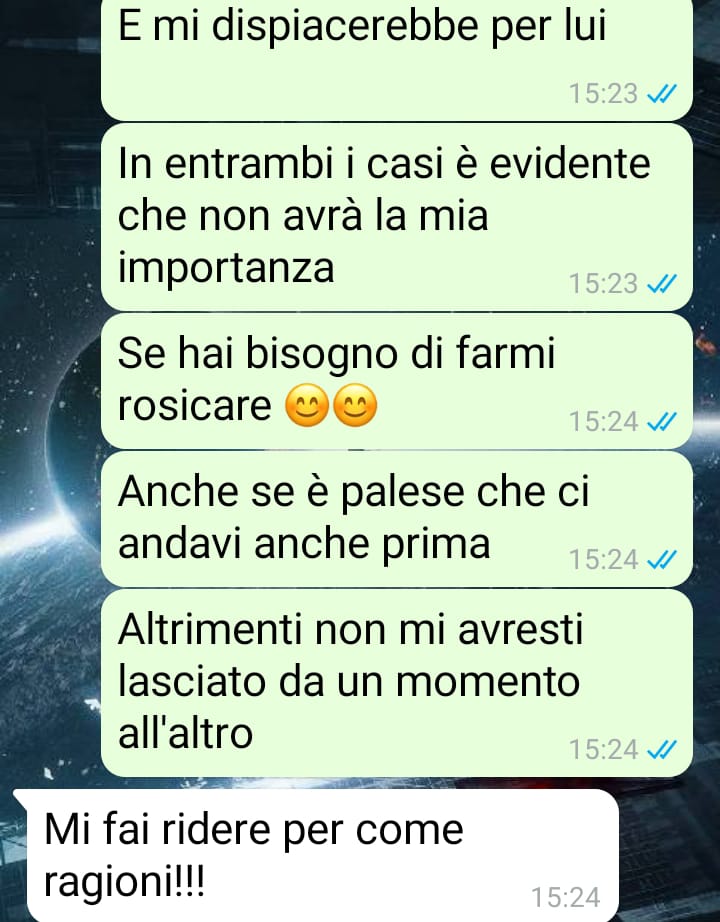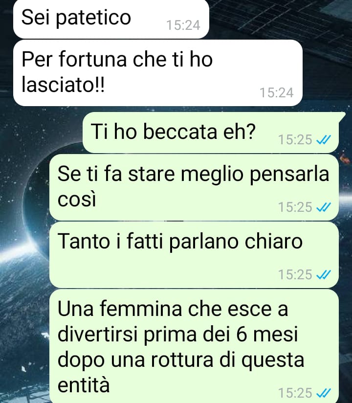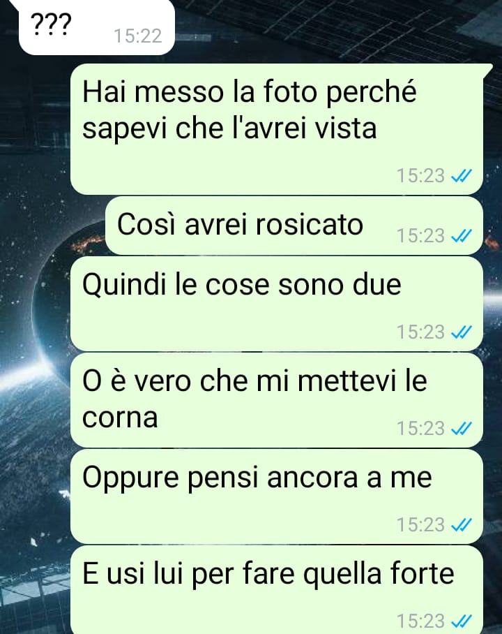 Aggiunge che leggere quelle risposte lo ha fatto arrabbiare, ma allo stesso tempo gli ha aperto gli occhi: si è reso conto che probabilmente era meglio così, perché stare con una persona capace di chiudere una relazione di otto anni in modo tanto superficiale e freddo non poteva portare da nessuna parte.