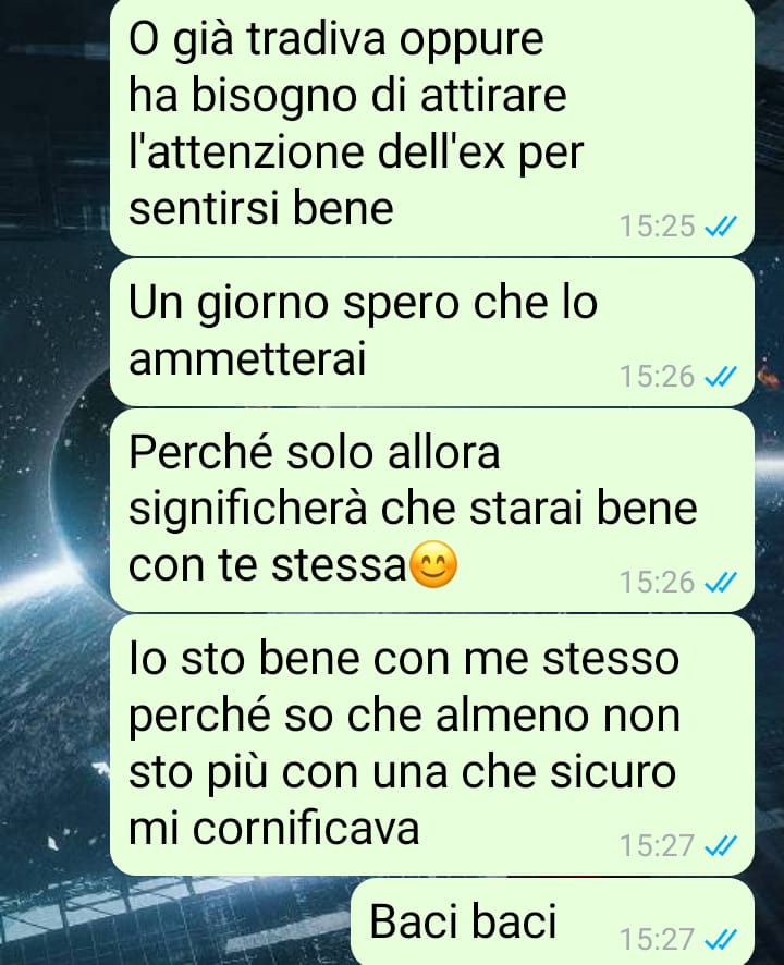 Conclude il suo racconto con un misto di amarezza e sollievo, dicendo che sì, fa male rendersi conto di aver amato qualcuno che forse non ricambiava allo stesso modo, ma che è anche un bene scoprire la verità, per quanto dura possa essere. Ora, dice, deve solo trovare la forza di ripartire, anche se quel vuoto lasciato da otto anni insieme non sarà facile da colmare.