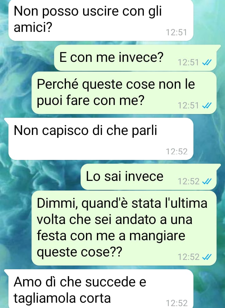 La nostra fan racconta di aver lasciato il suo ragazzo tramite un messaggio su WhatsApp. Spiega di stare molto male per quanto è accaduto e, soprattutto, per le parole che lui le ha rivolto durante lo scambio finale. Secondo quanto riferisce la nostra amica, ha deciso di condividere gli screen della conversazione perché ritiene importante mostrare che esistono persone con certi atteggiamenti e determinati modi di pensare.
