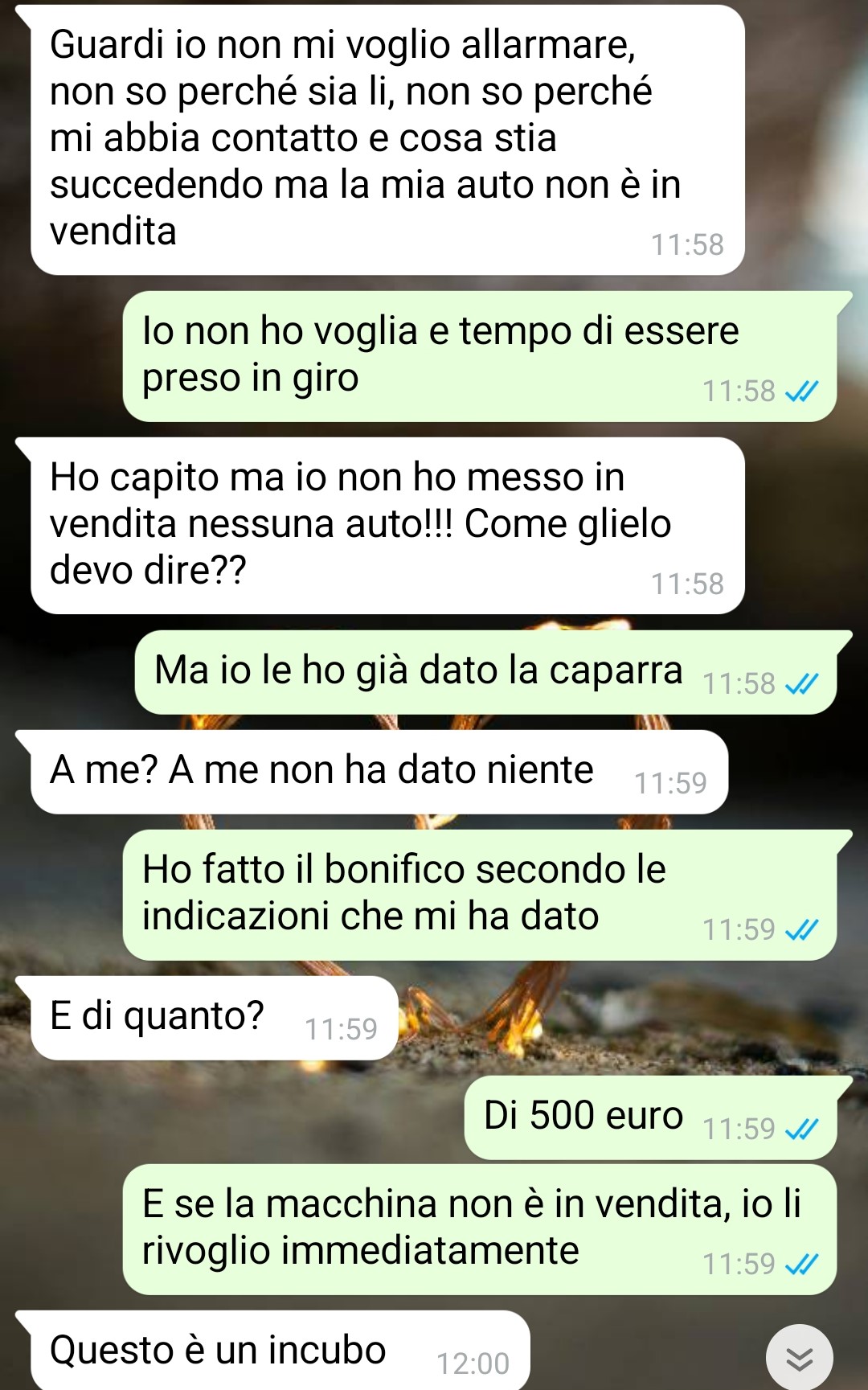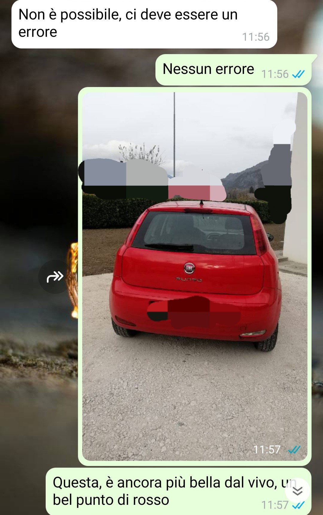 Purtroppo, circa tre mesi fa, la mia amata auto si è spenta definitivamente (sono una persona che si affeziona al suo mezzo di trasporto e cerco sempre di utilizzare le macchine il più possibile). Non sono uno che naviga nell’oro e quindi mi sono messo subito a cercare una nuova macchina da comprare (nuova per me, non posso permettermi un’auto nuova). Dopo varie ricerche ho trovato questa Fiat Punto rossa che, a primo impatto, sembrava giusta per me. Ho scritto al proprietario tramite l’annuncio, mi ha spiegato tutto con dovizia di dettagli e poi siamo rimasti d’accordo che in cambio di una caparra per fermare la macchina, sarei andato sul posto, l’avrei vista, l’avrei provata e se non ci fossero stati problemi di nessun tipo da parte mia l’avrei ufficialmente acquistata. Mi sembrava una buona soluzione. Arrivo sul posto ed effettivamente la casa è quella che avevo visto anche nelle foto dell’annuncio, e anche la macchina, parcheggiata nel vialetto, è proprio lei. Ma non c’è nessuno ad attendermi. Aspetto un po’ ma non arriva nessuno. Allora decido di scrivere al numero che mi era stato dato il giorno prima, e da lì è iniziata una vera odissea, vi dico solo che sono in ballo (e in attesa, ma poi capirete) da più di un mese.