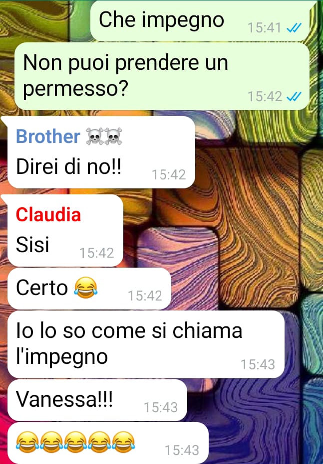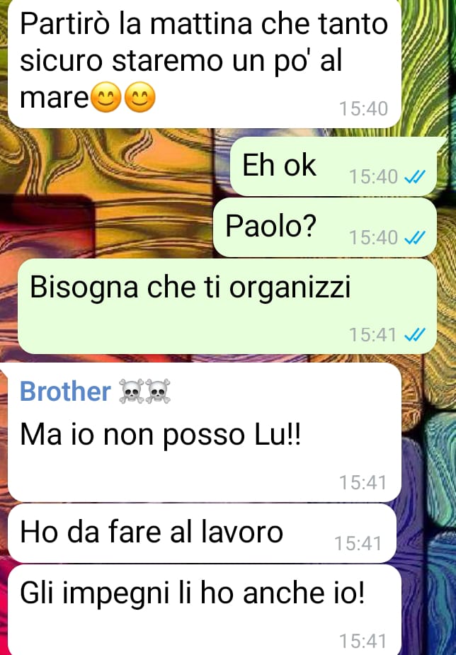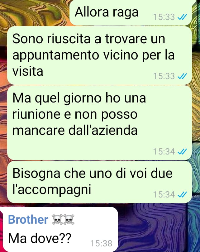 Mi chiamo Luisa e quello che sto vivendo con la mia famiglia è a dir poco vergognoso. La chat che vi ho inviato è del nostro gruppo di famiglia, dove ci sono i miei due fratelli e mia madre. Ho senFacebook e Buona lettura!