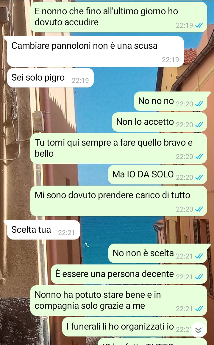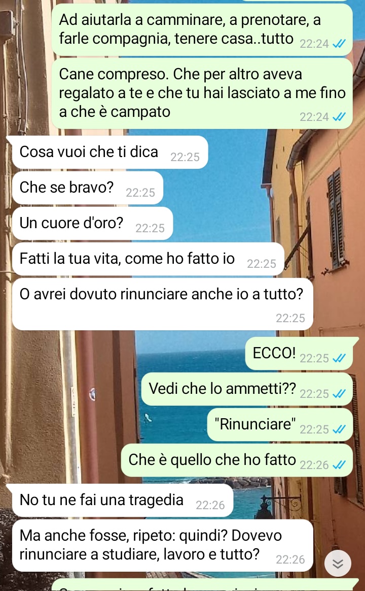 La nostra amica racconta di avere trentadue anni e di essersi sempre occupato in prima persona dei nonni e della madre. Nel racconto il follower spiega che la sua famiglia ha dovuto affrontare la mancanza del padre, che molti anni fa ha scelto di allontanarsi e di abbandonare la famiglia. Da quel momento, secondo quanto racconta il nostro fan, molte responsabilità sono ricadute su di lui. Il nostro amico descrive questa situazione come un impegno portato avanti con senso del dovere e affetto, ma anche come un percorso fatto di sacrifici e rinunce che hanno segnato profondamente il suo quotidiano.