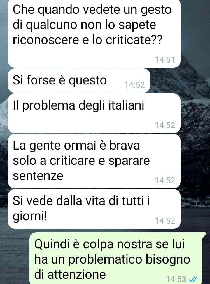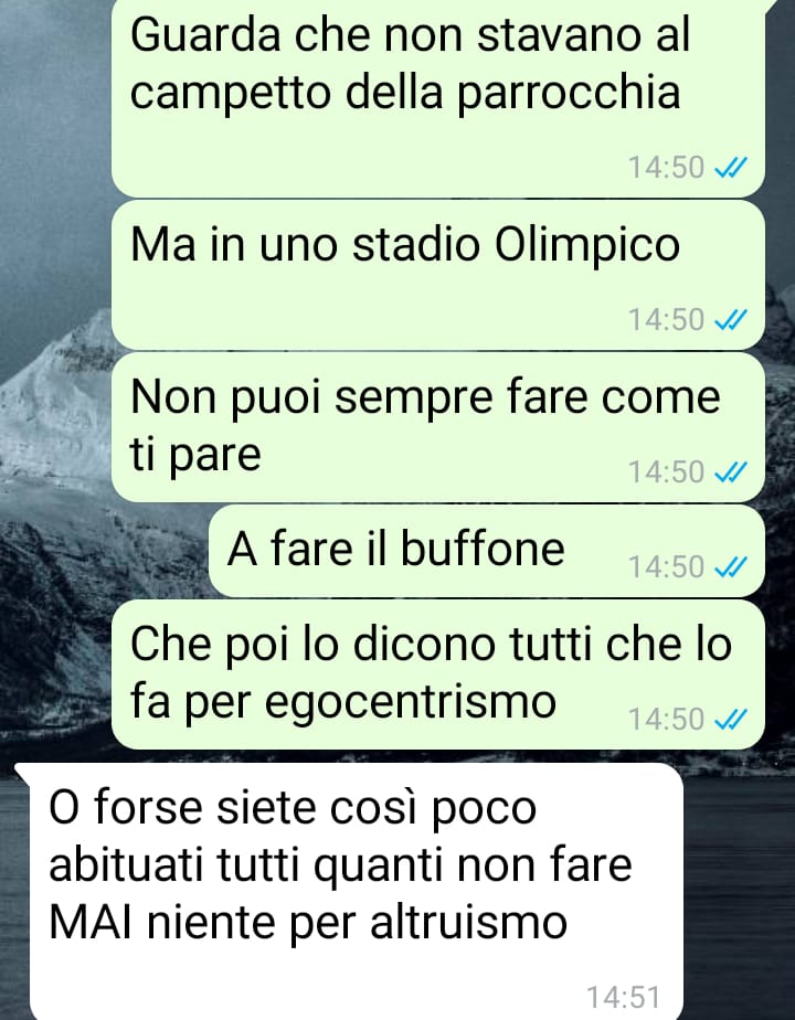 Il nostro fan racconta di aver avuto un acceso litigio con la sua ragazza in seguito a una discussione scaturita da un episodio legato alle Olimpiadi. L’origine del diverbio sarebbe, a suo dire, un attacco isterico da parte della compagna, che ha portato a uno scontro verbale particolarmente acceso.