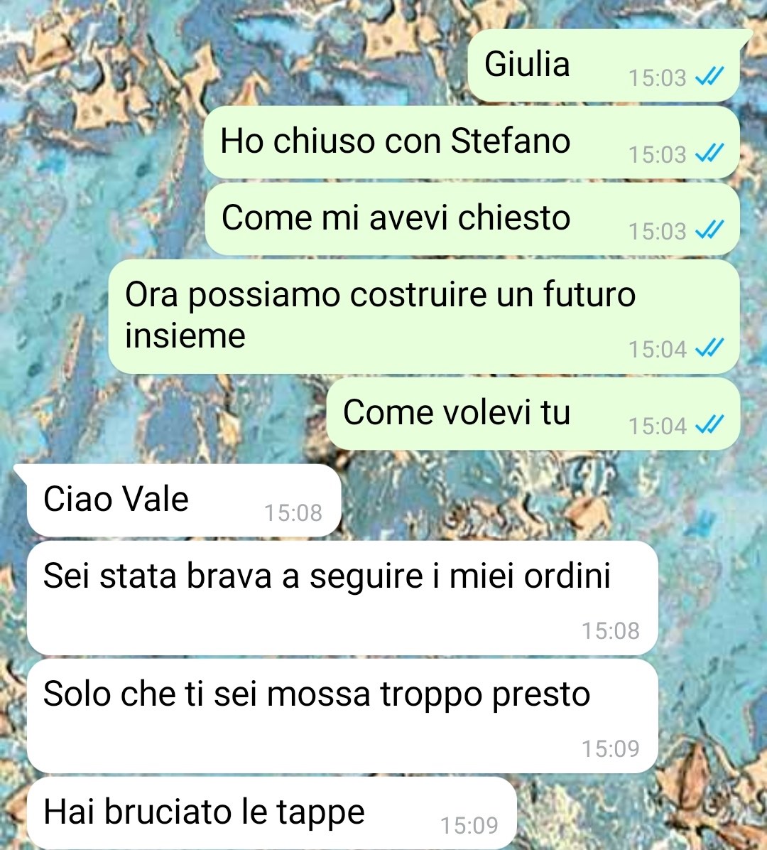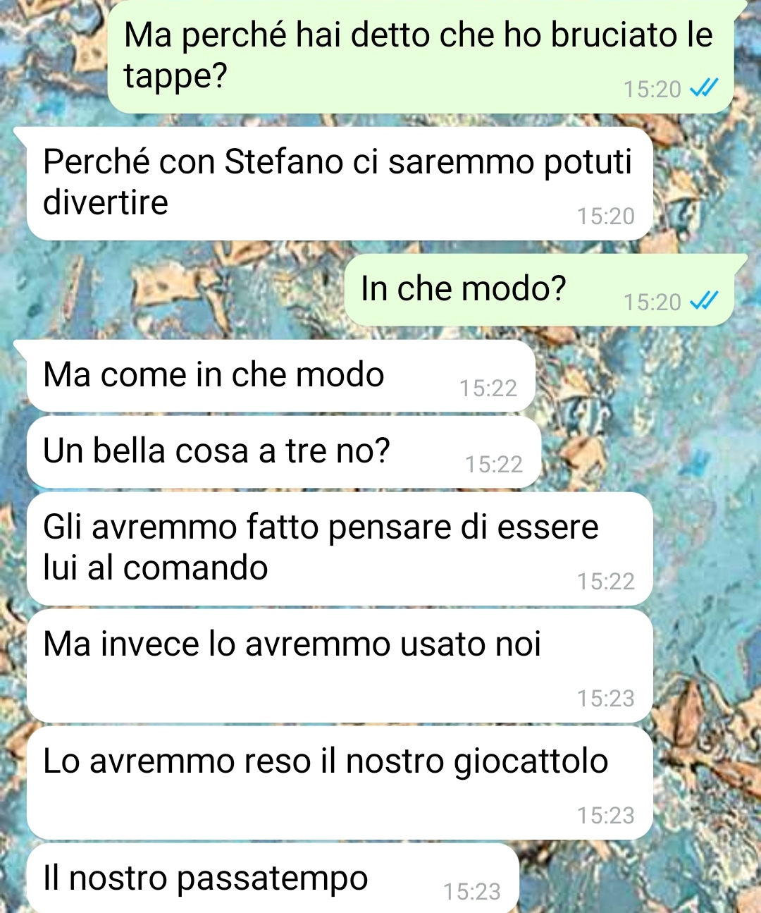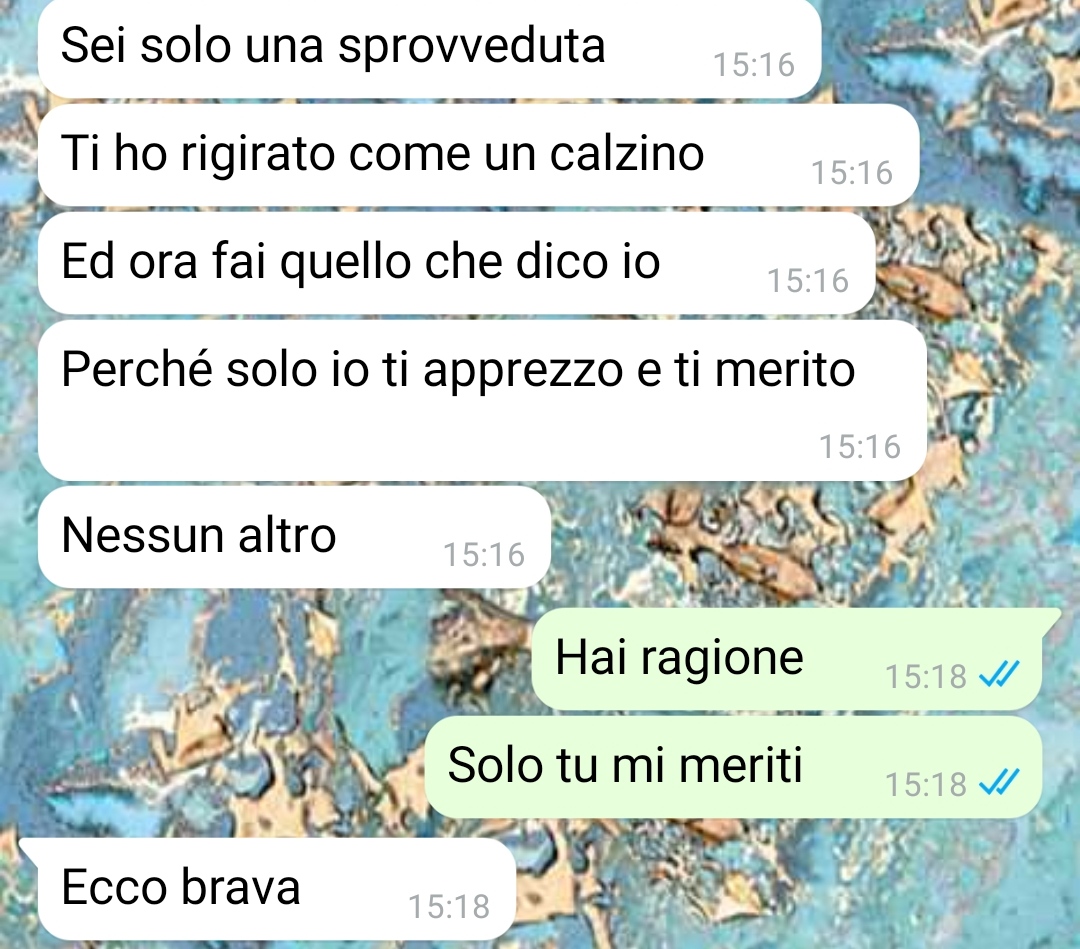 “Ciao commenti Memorabili, sono ancora Valentina, siamo arrivati al clou della storia, dove tutti i nodi vengono al pettine e finalmente capirete il perché ho sempre parlato di una situazione assurda nella quale mi sono travata in maniera casuale e improvvisa. Sembrerò stupida nel dire questa cosa, ma adesso, vedendomi da fuori e guardando il passato, mi sento veramente un’altra, è come se quella persona in quel momento non fossi io, è come se avessi passato quelle due settimane in maniera catatonica, come se fossi in trans. Ci sono delle persone che riescono anche in brevissimo tempo a imporsi sulle altre, ed è questo il caso, io sono stata succube di questa persona, per fortuna per breve tempo, senza che io me ne accorgessi, ed è stata una cosa totalmente spontanea perché evidentemente il quel momento mi sentivo voluta bene da questa persona e non mi sono accorta che questa persona si stava approfittando di me e mi stava annullando, utilizzandomi solo per i suoi stupidi giochini. Siamo vicini all’epilogo di tutto.”