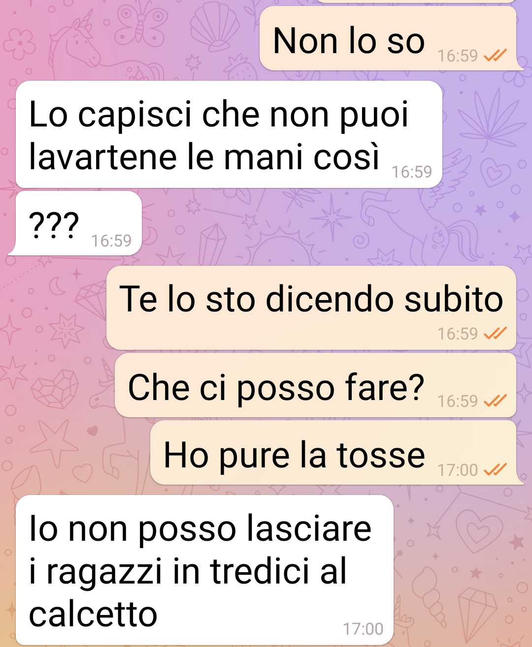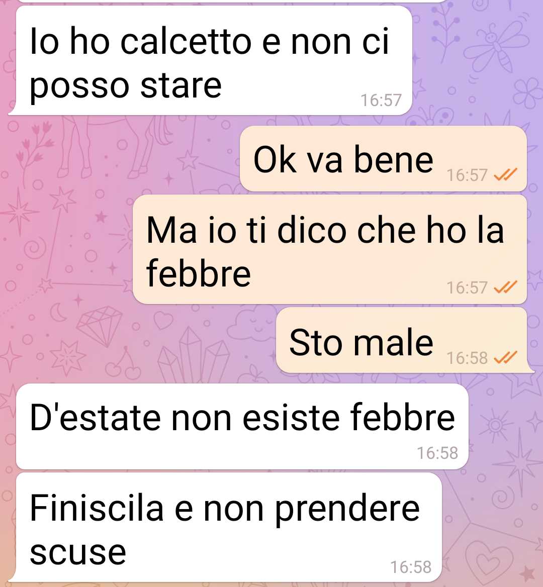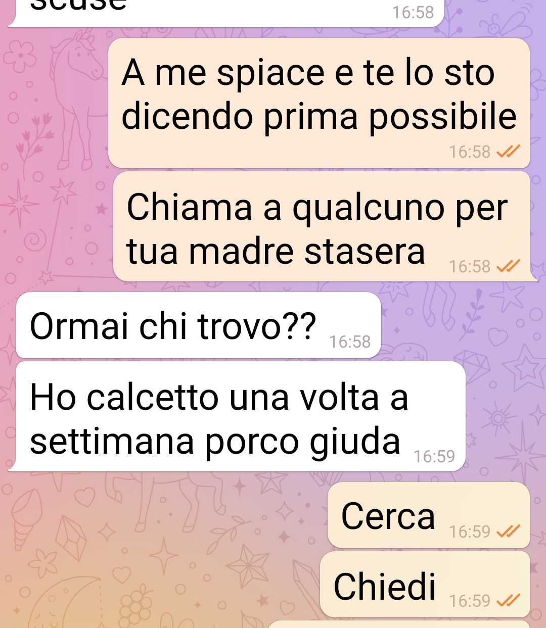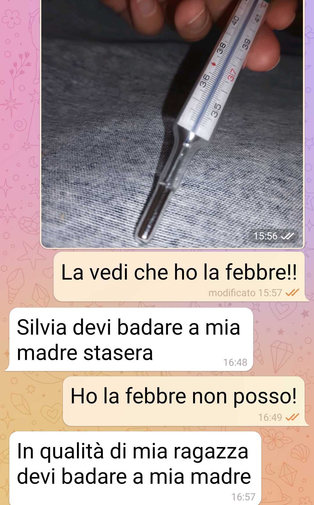Grazie alla febbre estiva mi sono salvata da una situazione spiacevole: badare a mia suocera. Sto con un ragazzo che pretende sia la badante di sua madre. No, non sto scherzando. Il mio ragazzo pretende che io faccia da badante a sua madre e che le prepari da mangiare e le dia da mangiare. Se ha bisogno poi l’accompagno in bagno sperando che non sia quella grossa. Insomma lo faccio alla fine. Lho sempre fatto perché quello era il mio ragazzo e il mio futuro marito. ma oggi ho aperto gli occhi. Sapete quando hai una visione del futuro, quando ti viene una intuizione e capisci tante cose in un colpo solo. Mi sono vista allo specchio e mi sono detta ma sei scema?? Ma che faii??? Ma lo capsici che sta succedendo?? Avevo l’ idea romantica di sposarmi e farmi una famiglia e avere ei figli. Ma quanto costa tutto questo??? Quanto mi costa realizzare un desiderio preconfezionato e che è uguale per milioni di donne nel mondo??? Mi sono guardata allo specchio e ho capito. Vi mando questi screen qui sotto della chat col mio ragazzo per celebrare questo momento della mia vita.