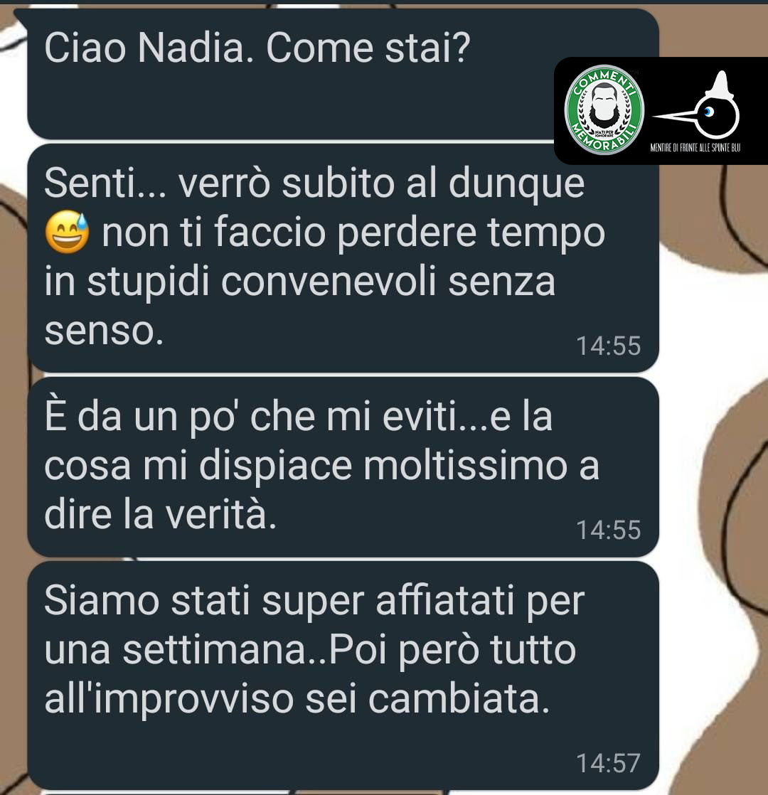 “Mi chiamo Nadia e ho 29 anni. Mi piace leggere, sognare, perdermi nei miei pensieri e fantasticare su mondi immaginari (di cui scrivo anche, pensate che sfigata!). Non bevo e non fumo, e questo mi ha reso un’adolescente un po’ timida e insicura. Ero anche piuttosto bruttina, ammettiamolo pure (tanto spero che nessuno mi riconoscerà). Mia madre era di quelle che proibiva i trucchi e le cerette alla sua “bambina”: immaginate il risultato. Per fortuna poi sono cresciuta e sono andata via di casa presto (grazie Bologna, paradiso dei fuori-sede). È stato per me il momento di maggiore rinascita: sono riuscita a lavorare, studiare e finalmente (dopo che la ginnastica e l’apparecchio hanno fatto la loro parte, anche se gli occhiali me li sono dovuti tenere perché sono ciecata come una talpa) ad essere anche un po’ carina! Del tipo che i ragazzi mi chiedevano il numero, o flirtavano con me (immaginate io che imbranata), e mi chiedevano di uscire perfino – pensate da che disagio partivo… Ho superato per fortuna quel momento di mega impaccio, però sono rimasta un po’ ingenua sul campo sentimentale (complice il fatto che da adolescente non ho avuto modo di farmi le esperienze che fanno tutti), e mi sono presa un paio di fregature, nel senso che sono uscita per qualche tempo, prima con un ragazzo della mia età, e poi con un uomo un po’ più grande, per scoprire in entrambe le occasioni che erano rispettivamente fidanzato e sposato. E io non sopporto cose di questo genere. Quindi mi sono ripromessa che con il prossimo con cui sarei uscita (quello della chat che vi ho mandato), avrei fatto una mega attenzione anche ai piccoli dettagli che potevano indicare partner nascoste. Questo spero che serva un po’ a giustificare l’enorme figura di emme che vi condivido, per istinto esclusivamente masochistico.”