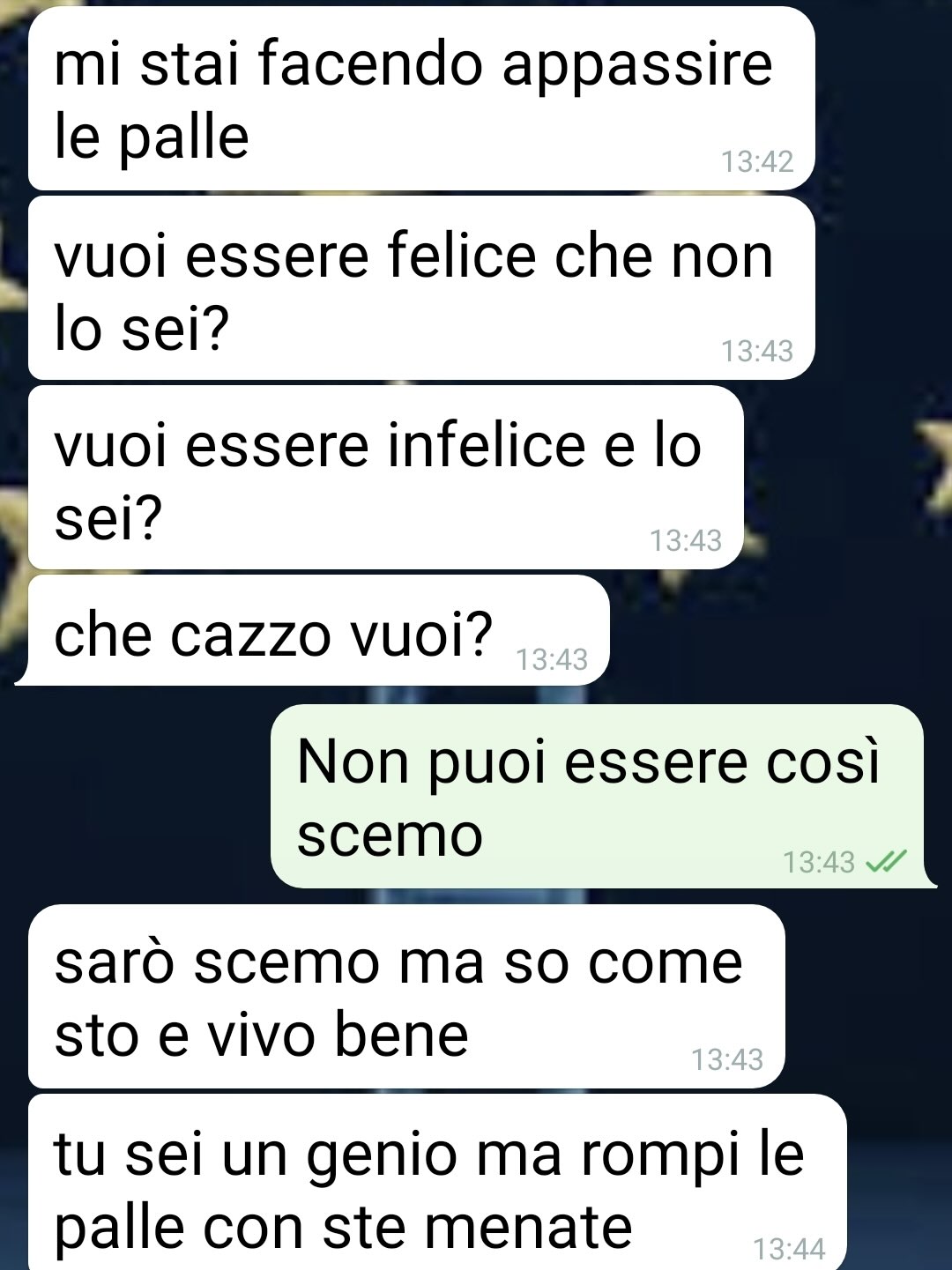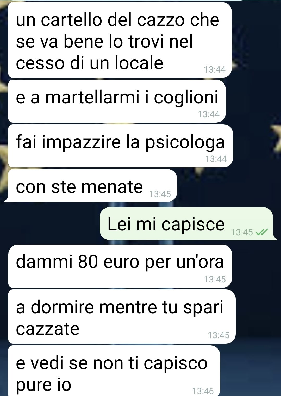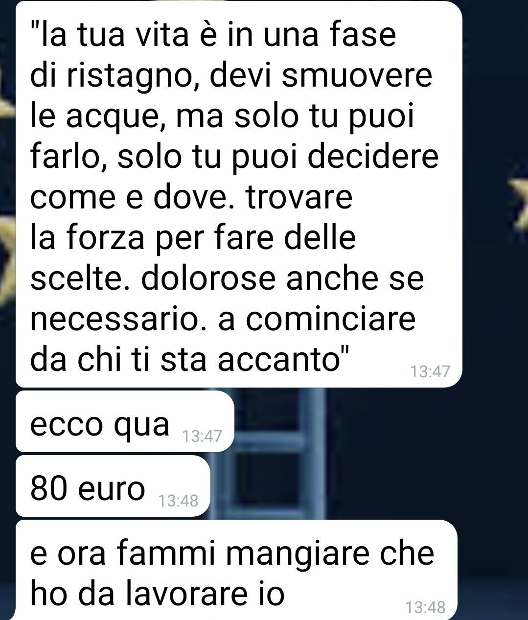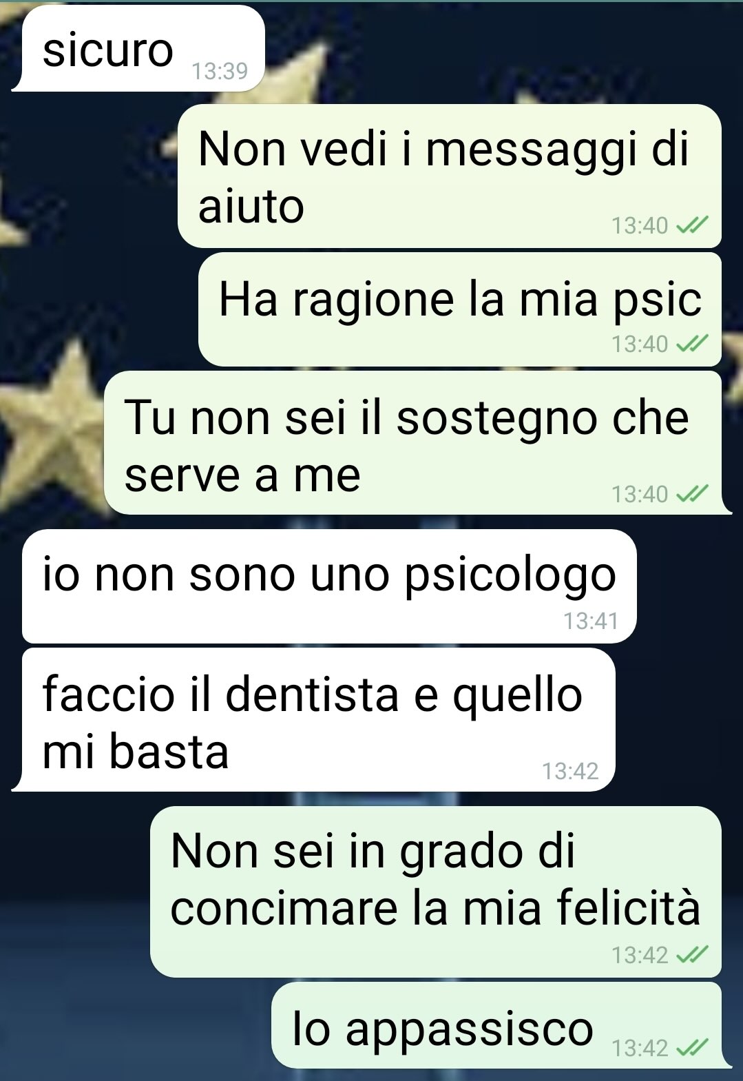 Ha provato a convincersi che la relazione non fosse legata al malessere che sente, ma questa conversazione – che ha deciso di inviare – le ha fatto realizzare che forse è proprio la convivenza con questa persona a contribuire al suo affondamento emotivo. L’iceberg, come lo definisce, che la sta facendo andare a fondo.
