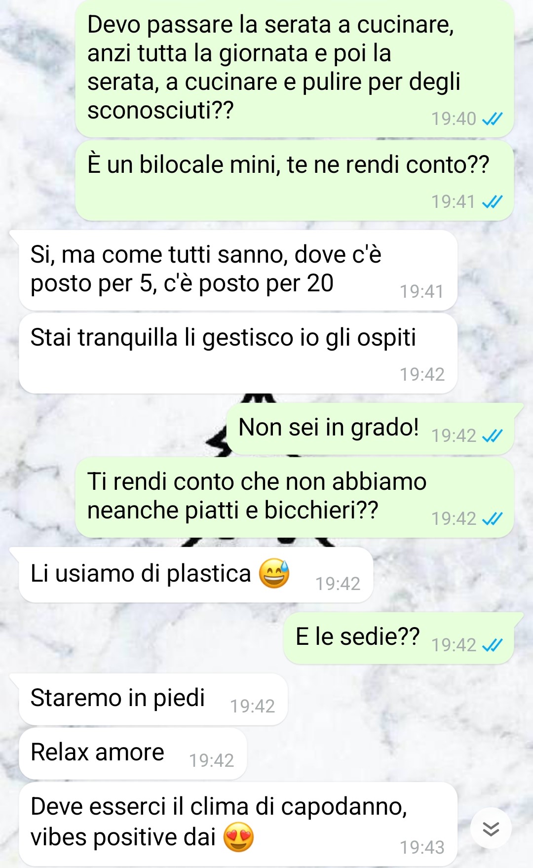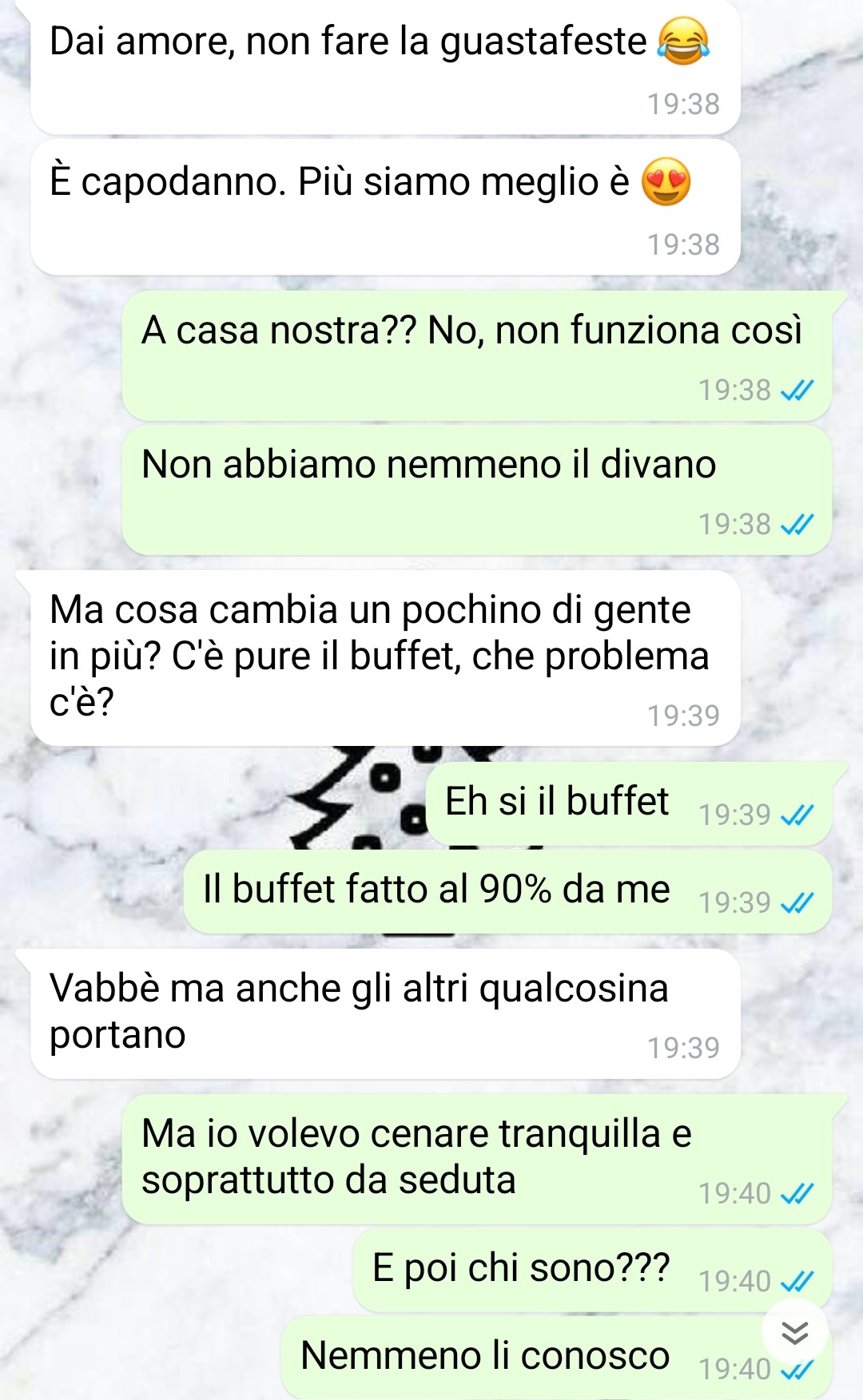 Il problema di Mattia è che si rifiuta di crescere. Vive come se fosse ancora un ragazzino, senza preoccuparsi minimamente delle conseguenze delle sue azioni. Ogni volta che c’è una decisione da prendere, lui sceglie sempre la strada più facile: quella che gli permette di divertirsi, fregandosene di tutto il resto. E chi rimane a raccogliere i cocci? Io, ovviamente. Mattia non capisce che vivere insieme significa rispetto, compromessi e responsabilità. No, lui preferisce fare quello spensierato, che “tanto tutto si aggiusta”, come se bastasse sorridere per risolvere i problemi. Non si chiede mai cosa comportino le sue scelte, non si preoccupa mai di quello che lascerà dietro di sé. Invita decine di persone a casa nostra senza pensare allo spazio, al rumore, alla pulizia. Per lui conta solo fare il “figo”, il re della festa. E sapete cosa mi fa più arrabbiare? Che si aspetta pure che io stia lì a sorridere, a fingere che vada tutto bene. Dovevamo organizzare una piccola festa di Capodanno a casa nostra, con 4/5 persone, ma in un attimo, senza che io sapessi nulla, sono diventate più di 20.