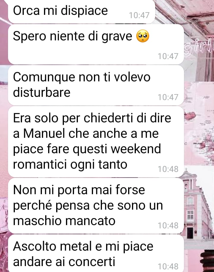 La nostra fan si è ritrovata coinvolta in una situazione surreale, senza aver fatto assolutamente nulla per causarla. L’unico “errore”, se così si può chiamare, è stato organizzare un fine settimana romantico con il suo fidanzato, Manuel. Un gesto semplice, pieno di affetto, che però ha attirato l’attenzione inaspettata di una terza persona: Chiara.