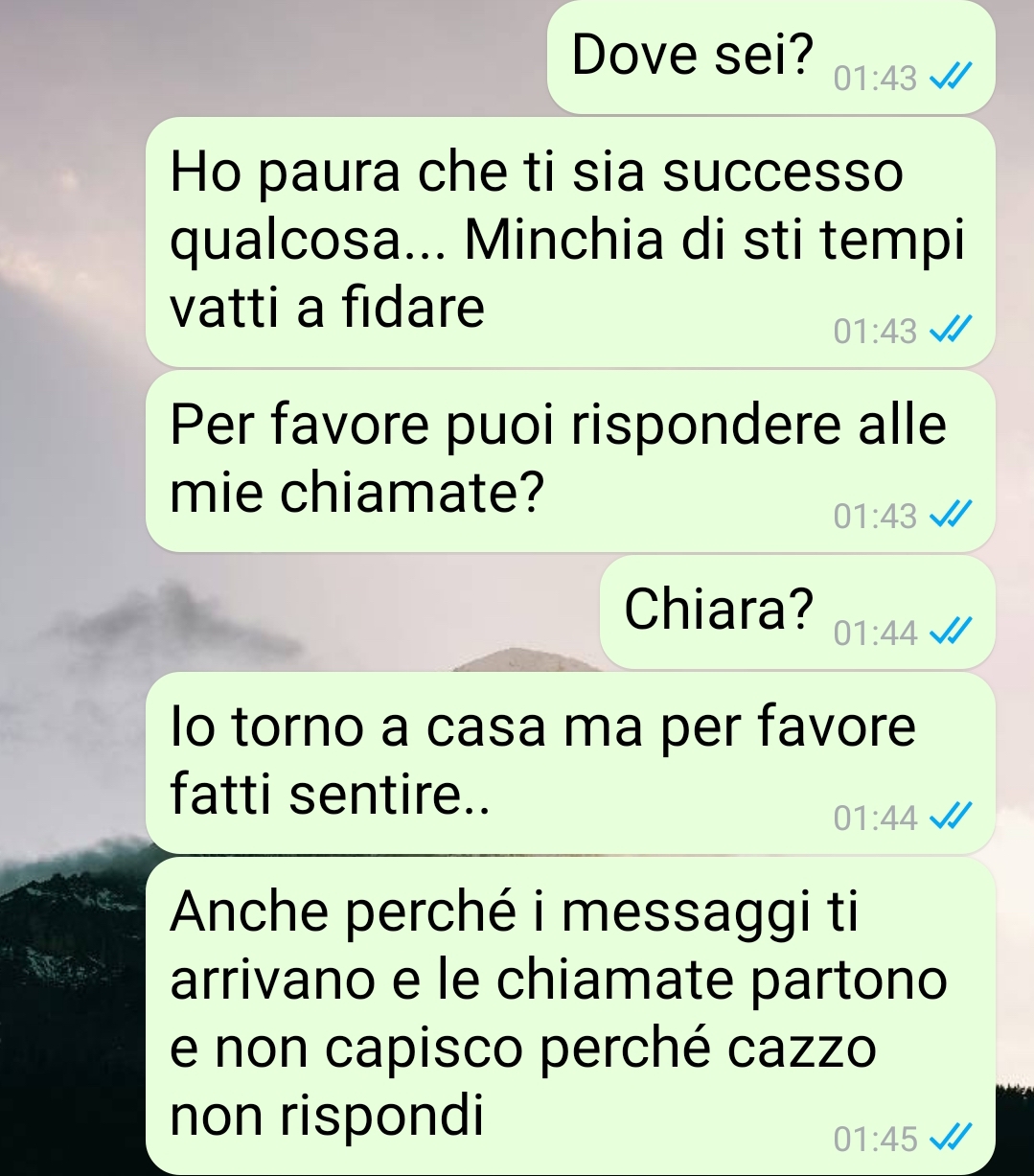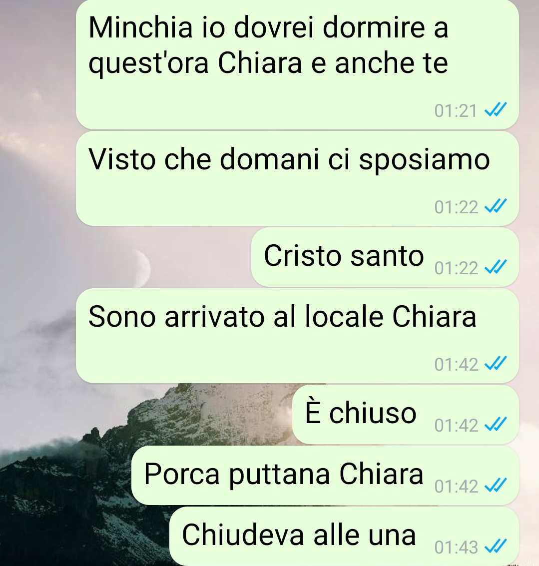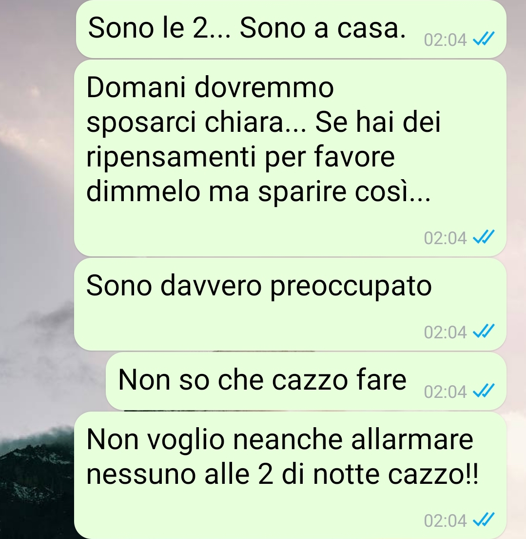 Io e Chiara stavamo insieme dal primo anno di università, abbiamo la stessa età (anche se dai messaggi che leggerete sembrava essere tornata alle elementari) e abbiamo avuto una relazione davvero meravigliosa. Tanto che appunto le ho chiesto di sposarmi. Mai un problema abbiamo avuto, ma non pensavo sarebbe successo un casino proprio la notte prima del matrimonio.
