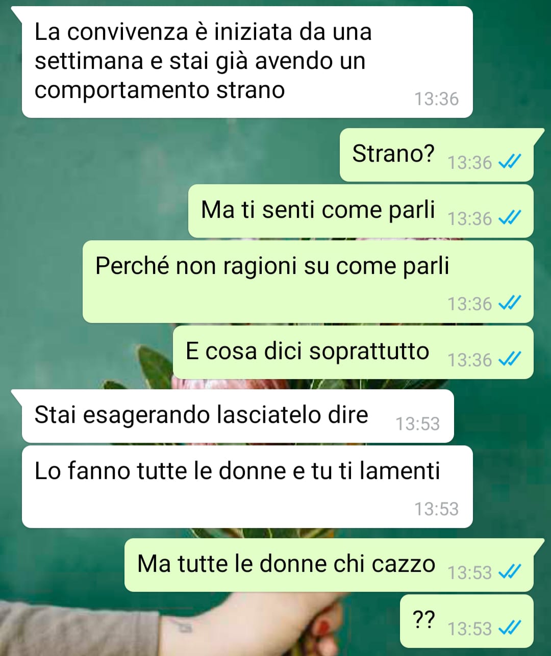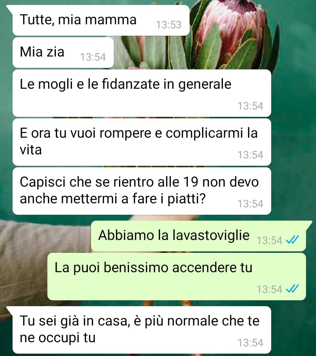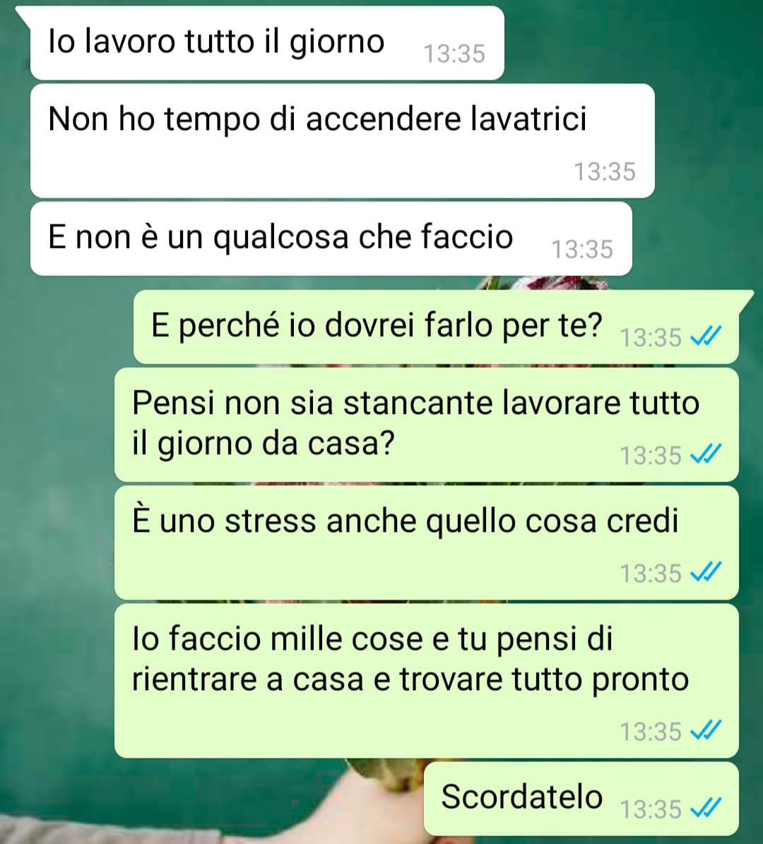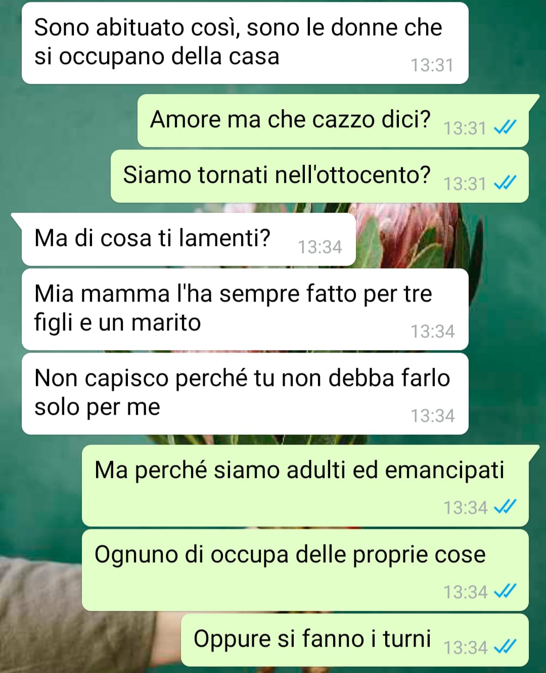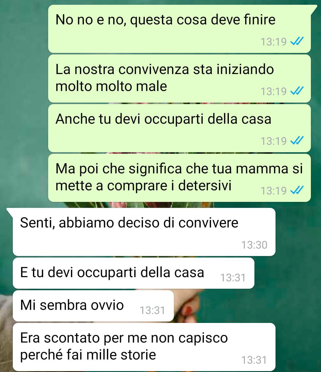 Il nome della persona è Laura e da poco più di una settimana ha iniziato a convivere con Luca, il suo fidanzato da 7 anni. Luca è cresciuto con due fratelli e nella sua casa era sua madre a occuparsi di tutte le faccende domestiche, dalla cucina alle pulizie. Al contrario, Laura è abituata a una divisione delle responsabilità domestiche basata sulla collaborazione reciproca, come ritiene sia giusto. Laura desidera condividere gli screenshot di una conversazione con Luca riguardo alle pulizie di casa, in cui lui le mostra tutti i detersivi che sua madre ha comprato per lei. Questo gesto ha lasciato Laura senza parole, poiché non si sarebbe mai aspettata che Luca potesse arrivare a tanto. Laura si chiede come poter far capire a Luca che anche lui deve aiutarla nelle faccende domestiche. Laura lavora da casa come libera professionista per l’intera giornata, mentre Luca torna a casa ogni giorno alle 19. Tuttavia, ciò non significa che il lavoro di Laura sia meno importante o meno faticoso del suo. Laura trova difficile comunicare con Luca e spiegargli il suo punto di vista, ed è un ostacolo che affronta con difficoltà.