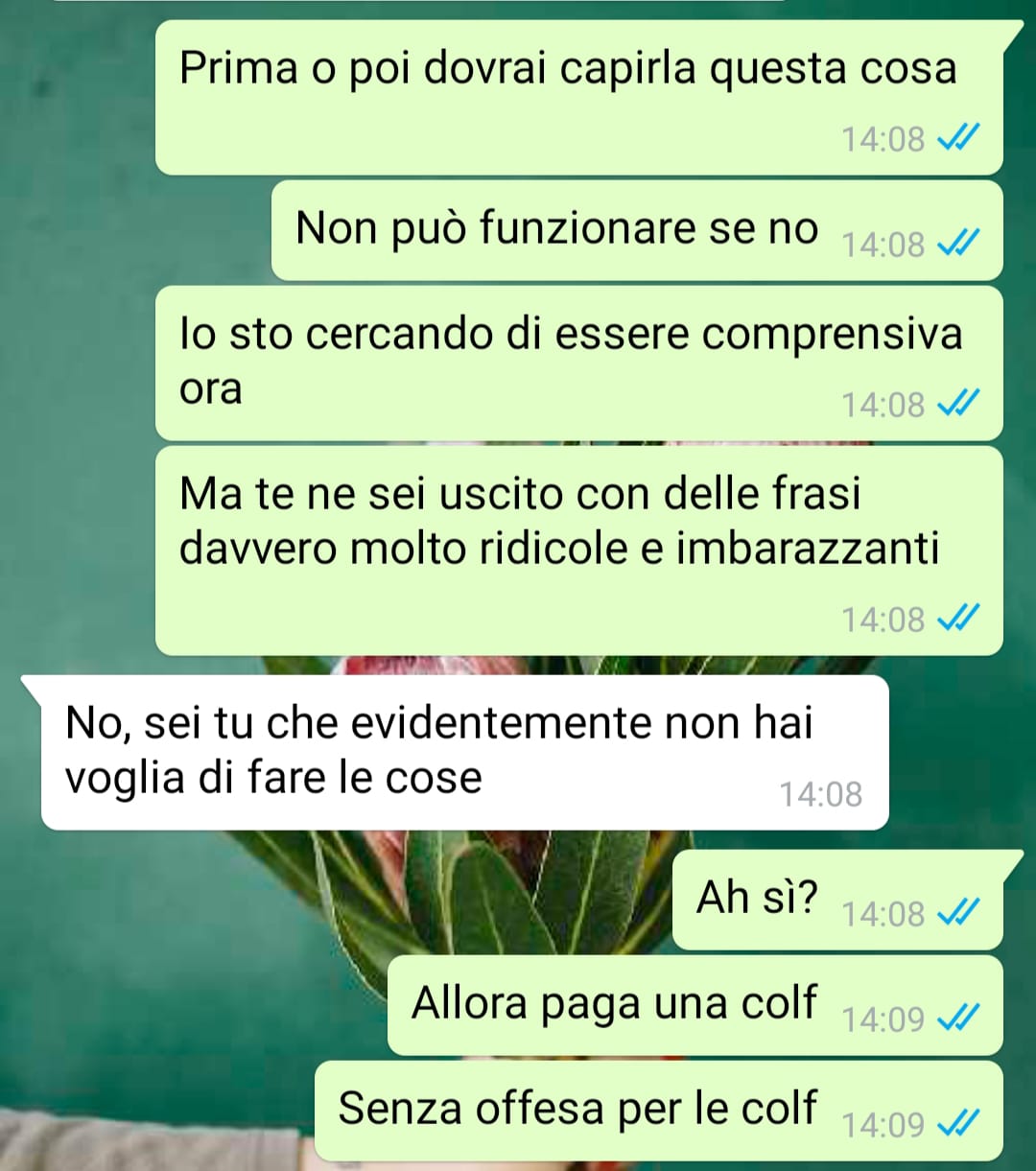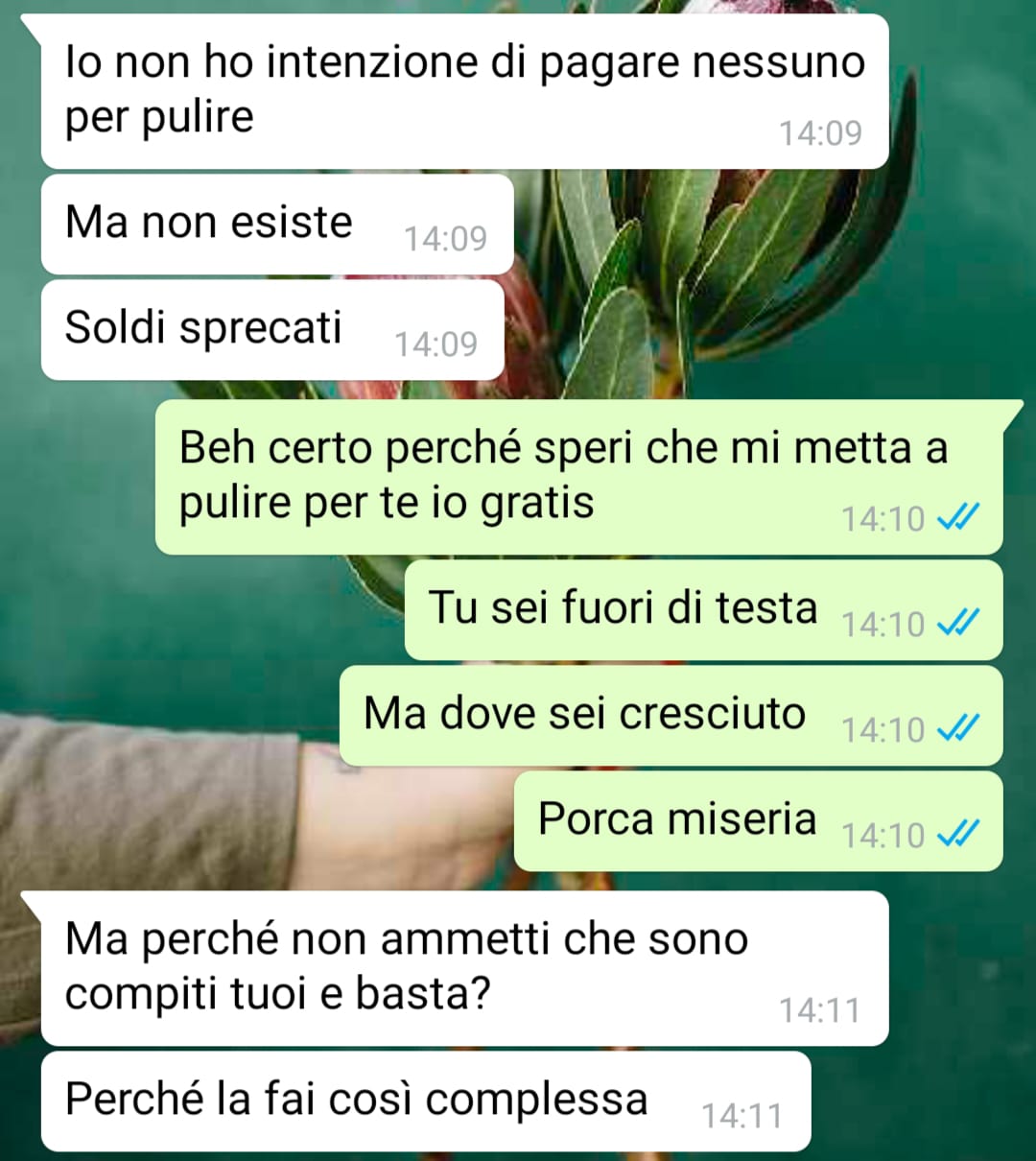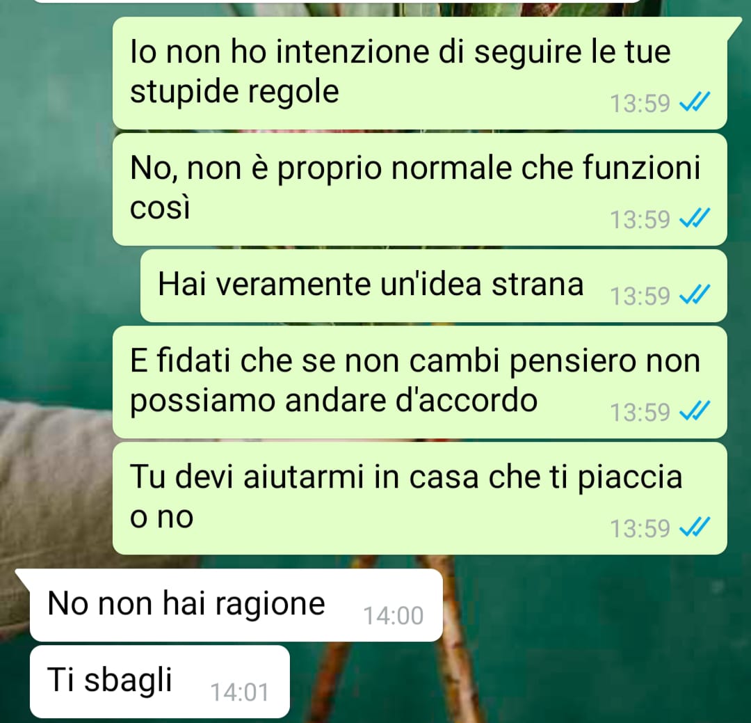 Laura desidera far comprendere a Luca l’importanza della collaborazione nelle pulizie domestiche e dell’equa distribuzione dei compiti tra di loro. Nonostante i loro differenti background familiari, Laura crede fermamente nella necessità di condividere le responsabilità per creare un ambiente equilibrato e armonioso. La sua professione come libera professionista richiede impegno e fatica, così come il lavoro di Luca. Laura cerca un modo per far capire a Luca che il suo contributo nelle faccende domestiche è fondamentale per bilanciare le responsabilità e supportarsi reciprocamente.