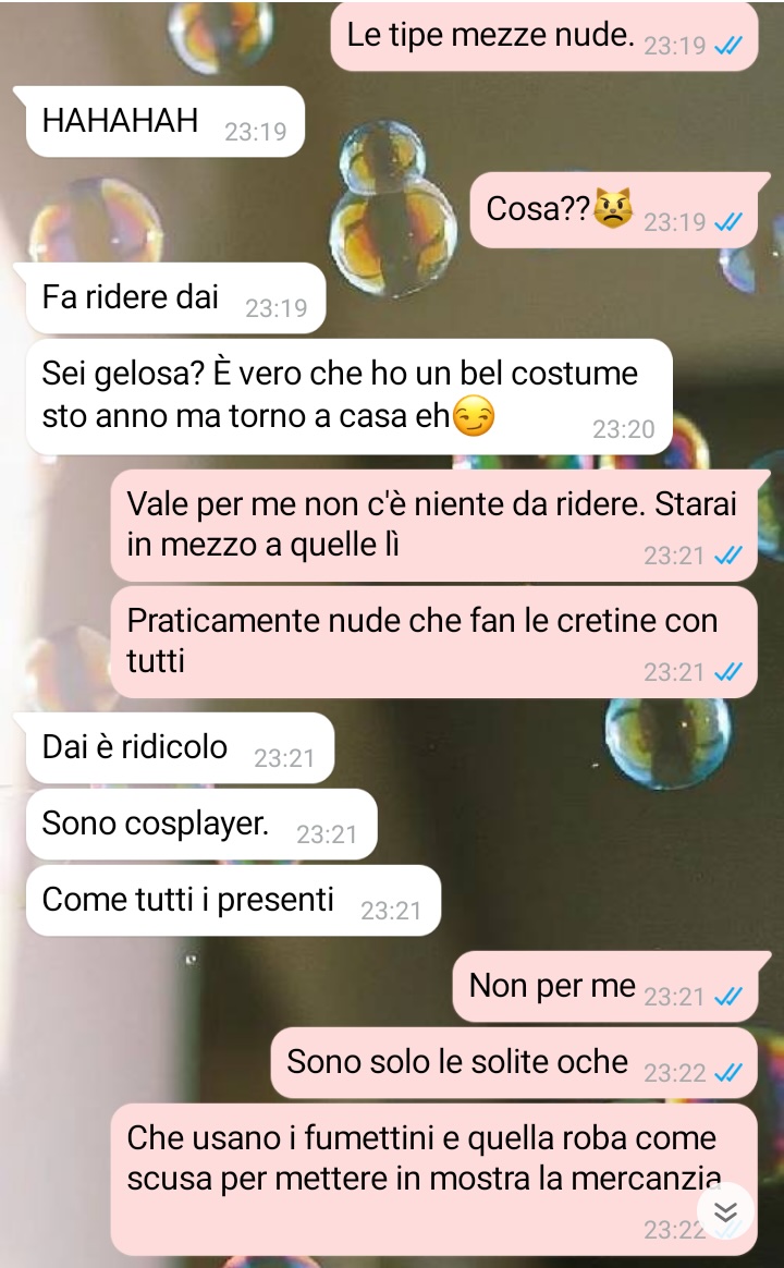 Ciao a tutti! Non pensavo avrei mai mandato anch’io una storia qui, ma parlandone con alcune amiche mi è sorto un dubbio: sono esagerata io oppure è una reazione normale? Io e il mio ragazzo conviviamo da un paio d’anni ma veniamo da una relazione piuttosto lunga. Non abbiamo mai avuto grossi problemi tranne uno…almeno da parte mia. La sua ossessione per le fiere di cosplay. Pur non partecipando mai, dentro di me ho sempre avuto qualche dubbio su questo suo incredibile bisogno di andarci ogni anno, soprattutto perché a me non invitava mai. Questo almeno fino a quando non l’ho sentito parlottare con degli amici (un gruppetto che ormai conosco anche io e con cui di solito va a queste fiere) di una ragazza in particolare. Anticipo solo che ho guardato il profilo di questa e tutto mi sembrava tranne che una nerd come loro. Ecco, diciamo che ho iniziato a fare un piano per scoprire come stavano esattamente le cose. Le reazioni a questo mio stratagemma sono state…contrastanti: qualche amica mi ha praticamente considerato una sorta di eroina, ma altre hanno ritenuto un po’ esagerato il tutto, addirittura mi sono sentita dare della pazza da qualcuno… All’inizio non mi importava, ma ormai sono giorni che ci rifletto e ho paura che forse possano aver ragione loro e la cosa mi fa stare abbastanza male. Ed eccomi qui, a chiedere l’aiuto del pubblico per capire se davvero sono strana io o alla fin fine si tratta di una cosa normale e, perché no, anche da poterci ridere sopra!