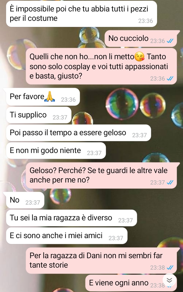 La nostra fan condivide una situazione che la porta a interrogarsi sulle proprie reazioni. Convive da un paio di anni con il suo ragazzo, dopo una relazione piuttosto lunga, e racconta di non aver mai avuto grossi problemi di coppia, eccetto uno che la preoccupa particolarmente. Il compagno ha sviluppato quella che lei definisce un’ossessione per le fiere di cosplay, eventi ai quali partecipa regolarmente ogni anno pur non praticando mai attivamente il cosplay. Ciò che infastidisce maggiormente la follower è il fatto di non essere mai stata invitata a queste occasioni, alimentando in lei dubbi e sospetti sul reale motivo di questo interesse così intenso.