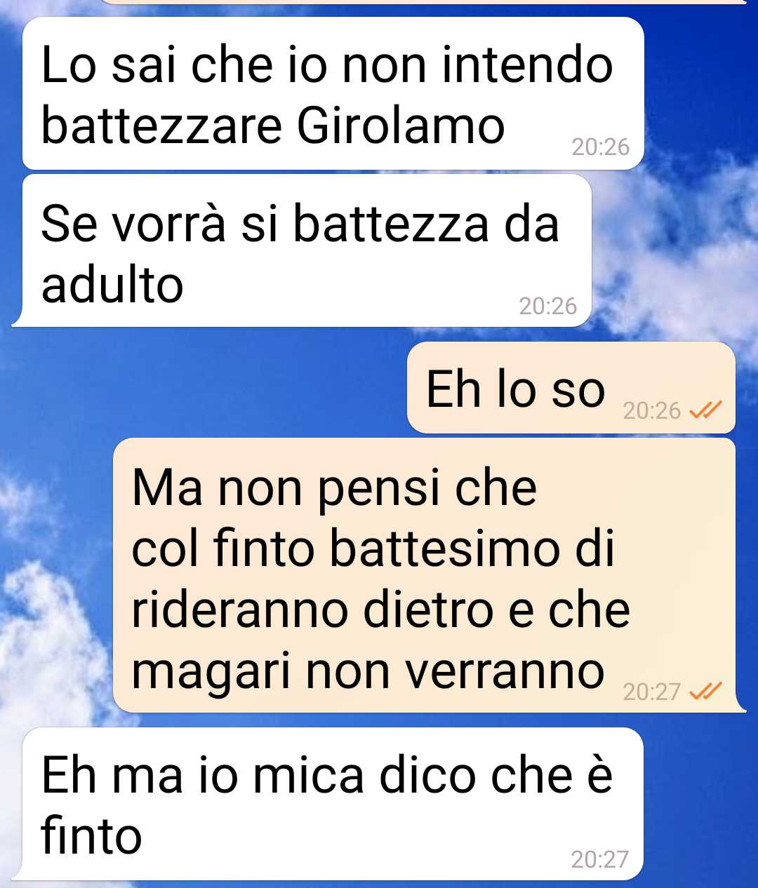 La nostra fan racconta un episodio curioso che riguarda una sua amica e un’idea che l’ha lasciata piuttosto sorpresa. Nel suo messaggio la follower spiega che questa conoscente starebbe pensando di organizzare per suo figlio una sorta di battesimo laico, definito dalla nostra amica come un “finto battesimo”. Il nostro fan racconta di essere rimasta colpita da questa proposta e di non considerarla affatto una cosa normale. Nel racconto la follower descrive l’amica come una persona piena di idee, spesso molto originali e, secondo lei, anche piuttosto stravaganti.