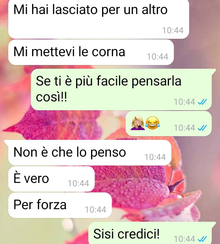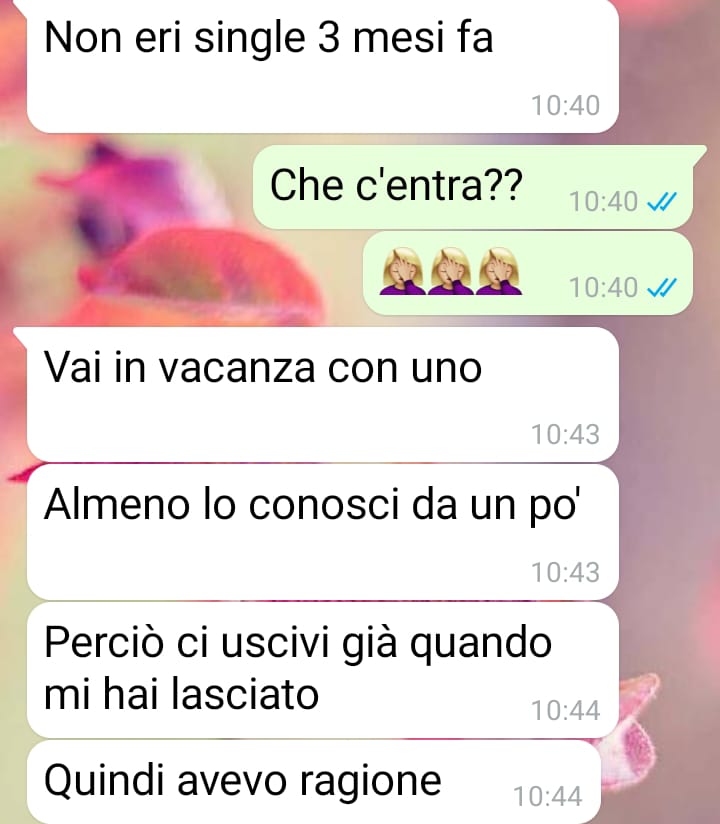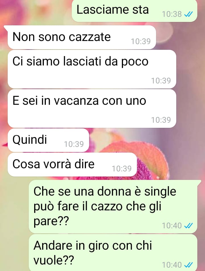 Vi mando questa fantastica chat da leggere per mostrarvi il ragazzo medio italiano, quello che parla di rispetto senza nemmeno sapere cosa significa! L’ho lasciato a seguito di vari motivi, ma nei successivi 3 mesi mi ha tartassato non poco, fino a rendersi totalmente ridicolo con questi messaggi. Ovviamente io ho sbagliato a non bloccarlo prima su tutti i miei social, permettendogli di vedere ogni singola cosa che postavo. L’ho fatto per cercare di fare la persona matura, perché onestamente credo che bloccare le persone online sia una cosa sciocca. Eppure, alla prima foto che ha trovato sul mio profilo con un ragazzo che non conosce, mi ha scritto per buttarmi tutta la merda addosso! Ormai è chiaro che i ragazzi fanno così, prima creano i problemi, poi incolpano le fidanzate di essere quelle ad aver sbagliato, affermando come fa lui nei primi messaggi di aver sempre agito bene durante la relazione. Visto e rivisto anche con altre mie amiche e la mia domanda è questa: perché fate così? Davvero non si riesce a capire che mandare avanti una relazione così è finto rispetto e che facciamo bene a lasciarvi? Bisogna riflettere!