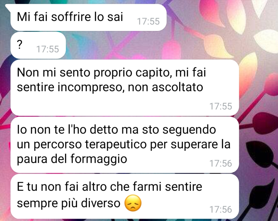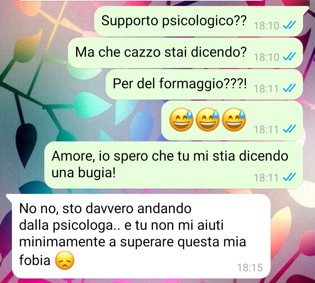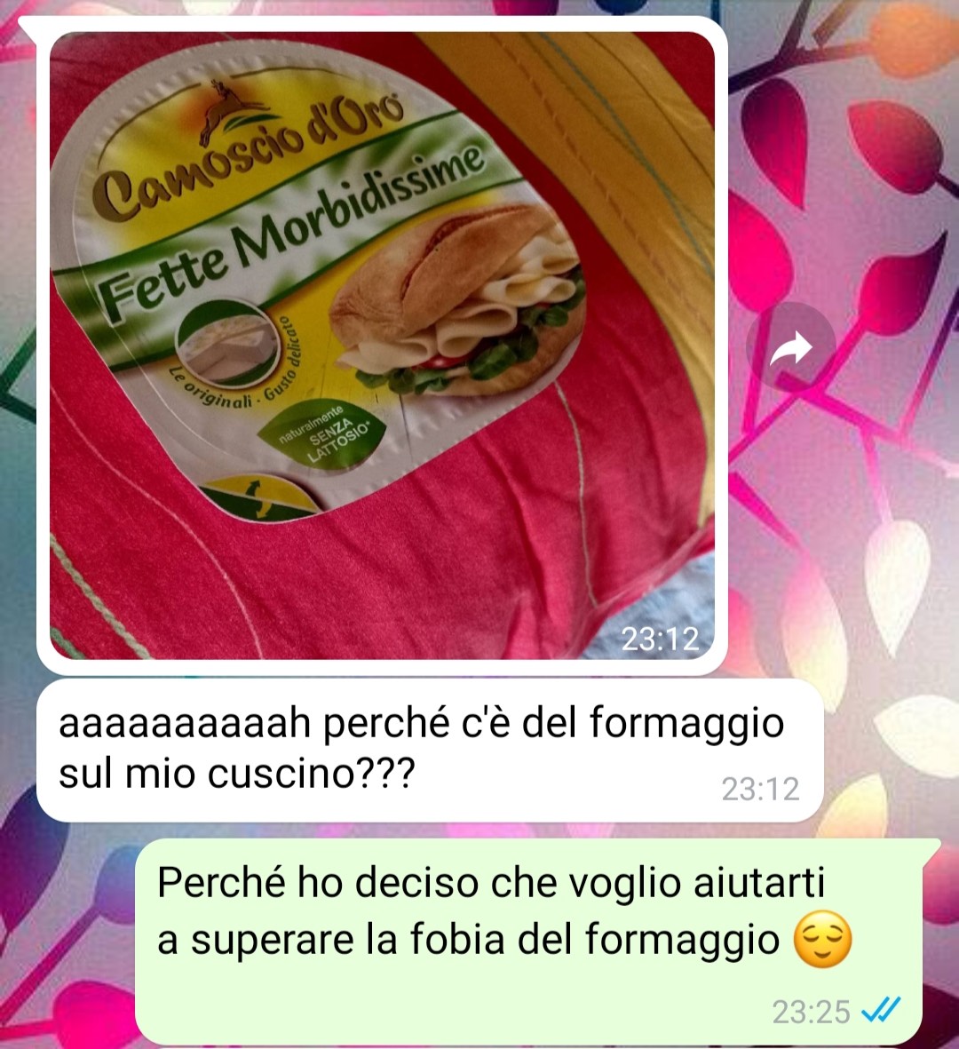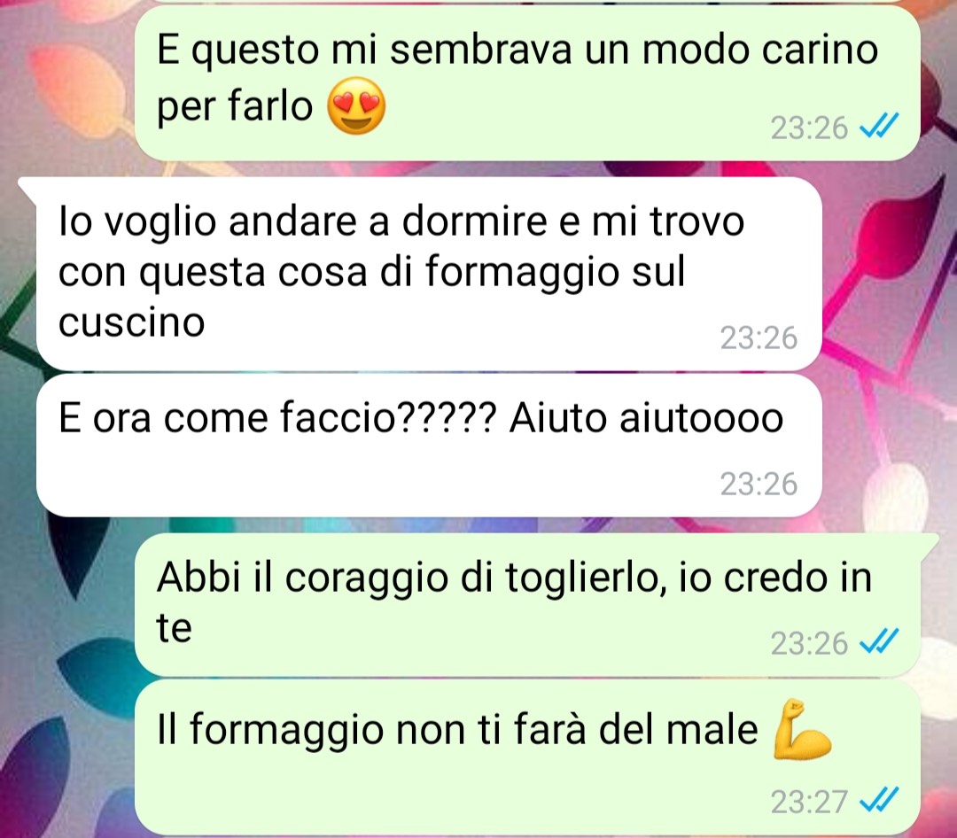 “.. nonostante questo ho deciso che questa sua paura verso il formaggio doveva finire in qualche modo. Perché io amo il formaggio e non posso sopportare di stare con qualcuno che lo ripudia. Così ho deciso di aiutarlo e credo proprio di aver trovato la soluzione ideale per fargli amare il formaggio, o comunque a tollerarlo. Anche perché non dimentichiamo che io sono una grandissima topolona e senza il formaggio non posso vivere!! Ho tantissime altre idee in testa, sexy e formaggiose allo stesso tempo, che non possono minimamente equiparare l’aiuto psicologico che il mio ragazzo aveva chiesto all’inizio!”