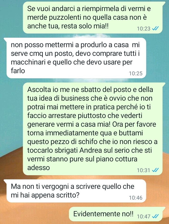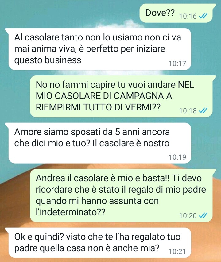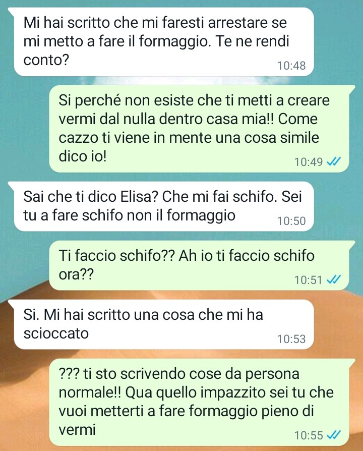 Una nostra fan, Elisa, racconta una vicenda che la vede alle prese con una situazione che definisce surreale e difficile da accettare. La protagonista dichiara apertamente di aver sposato, a suo dire, un “deficiente di prima categoria”, Andrea, con cui ha deciso di convolare a nozze cinque anni fa. Elisa spiega che, nonostante tutto, cerca di affrontare le stranezze del marito, ma l’episodio accaduto la mattina stessa è stato il colmo. Entrando in cucina, l’ha trovata invasa da vermi, una scena che l’ha lasciata sconvolta e furiosa.