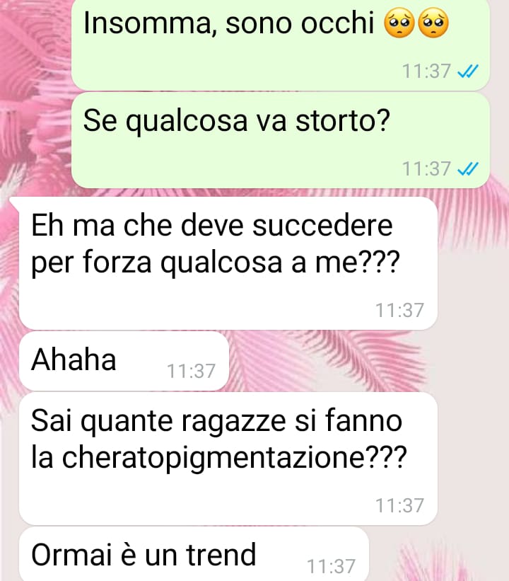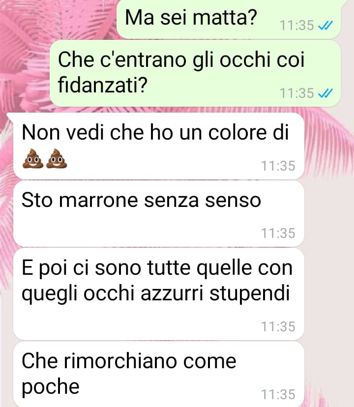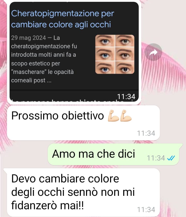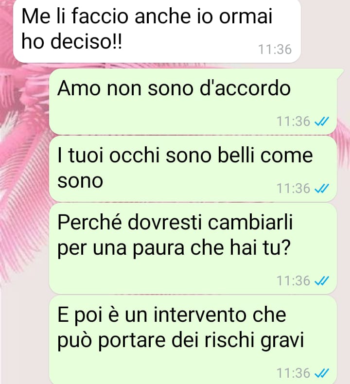 ho 23 anni e questa chat è con una mia cara amica che conosco dalle superiori. Usciamo spesso nel weekend e quando abbiamo bisogno ci confidiamo l’una con l’altra su tutto, o almeno pensavo. L’altro giorno se ne è uscita con un’affermazione che mi ha lasciata davvero amareggiata, ovvero il volersi cambiare il colore degli occhi con la cheratopigmentazione per paura di restare single. Non capivo perché dovesse pensare certe cose e le ho chiesto di spiegarmi cosa aveva nella testa. Quando mi ha svelato una piccola bugia che mi aveva detto ho capito che purtroppo anche lei è entrata in un circolo vizioso insieme a tantissime altre ragazze della mia generazione. Trovo tutto questo molto triste, perché i miei genitori mi hanno insegnato proprio il contrario di quello che sostiene lei. Ma chi ha davvero ragione? Leggete gli screen per capire di cosa sto parlando. Io l’unica cosa che so è che da quando mi sono sentita dire queste cose, la testa mi frulla giorno e notte e non so più che pensare.