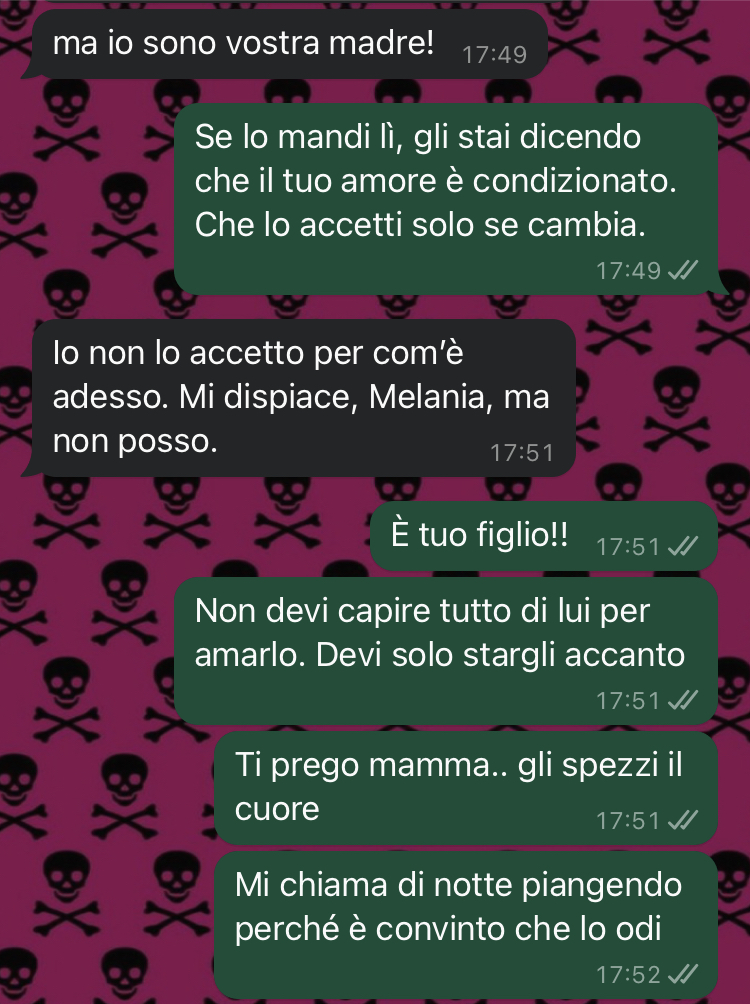La situazione ha raggiunto il culmine quando la madre ha confidato a Melania le sue intenzioni riguardo al figlio, lasciando l’amica completamente scioccata. La nostra fan non riesce a comprendere come una genitrice possa anche solo contemplare certe misure drastiche nei confronti del proprio figlio, unicamente perché questi non corrisponde alle aspettative che si era creata. Melania è particolarmente preoccupata per il luogo dove la madre vorrebbe mandare Carmelo e teme che possa davvero mettere in atto le sue minacce. La giovane si sente in dovere di non rimanere in silenzio di fronte a questa situazione e ha deciso di condividere la sua storia, sperando di ricevere parole di conforto e di sensibilizzare chi legge sull’importanza di accettare incondizionatamente le persone che si amano.