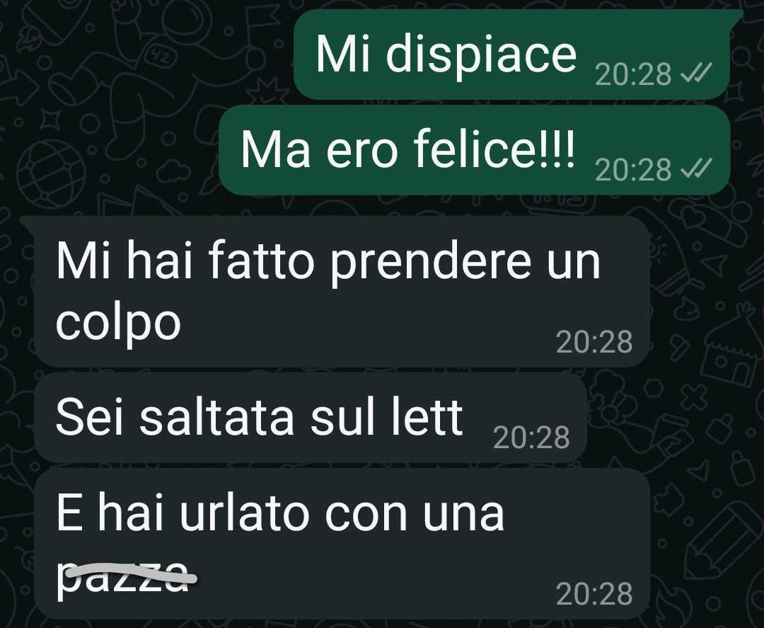 La nostra fan racconta di aver scoperto all’improvviso di essere incinta dopo aver notato un forte ritardo mestruale, evento insolito per lei che ha sempre avuto un ciclo regolare. Dopo aver fatto due test di gravidanza risultati entrambi positivi, la mattina ha provato un’esplosione di gioia incontenibile. Ha iniziato a urlare e saltare per l’emozione, sentendosi come se avesse vinto una battaglia importante contro le difficoltà della vita. L’amica descrive quella sensazione come se si fosse sentita ripagata da tutte le umiliazioni passate, invincibile e fortunatamente benedetta dal destino.