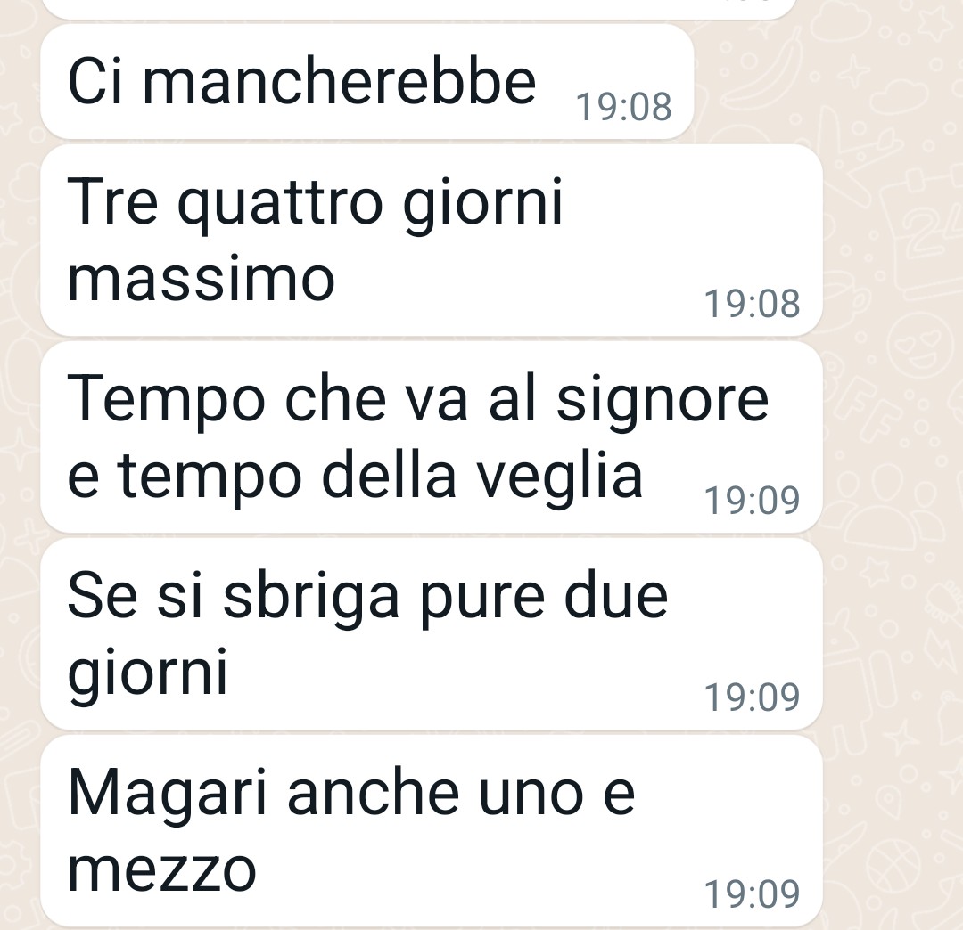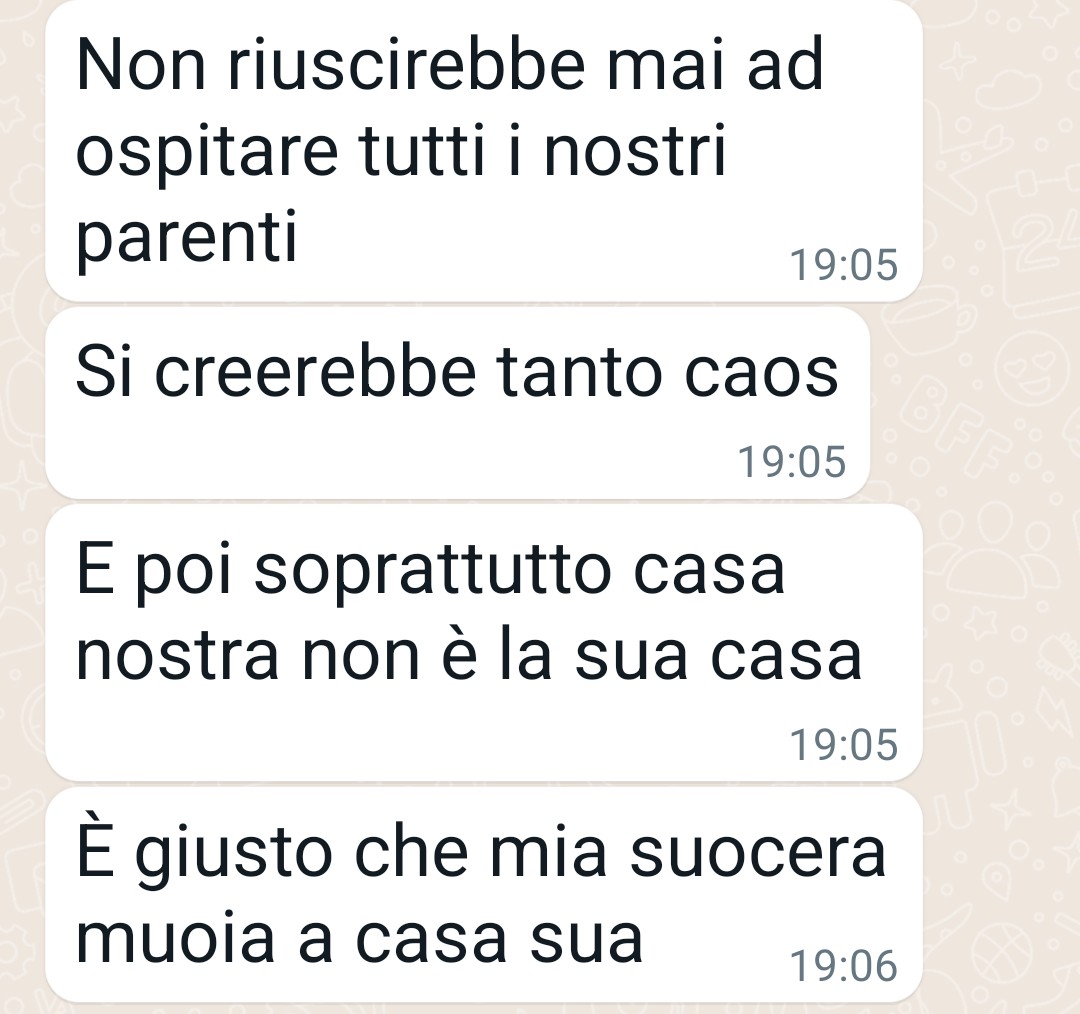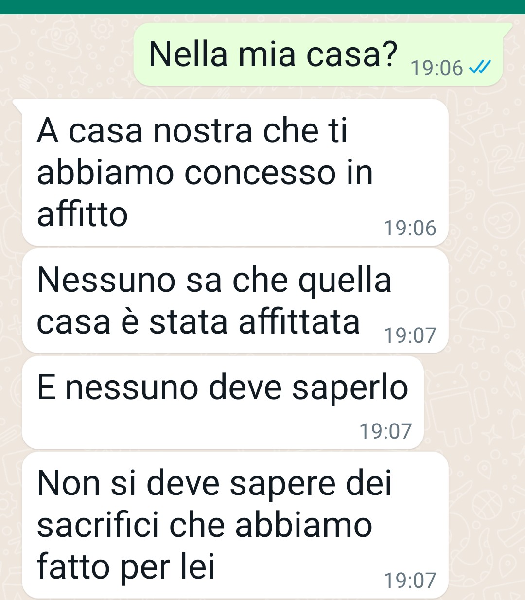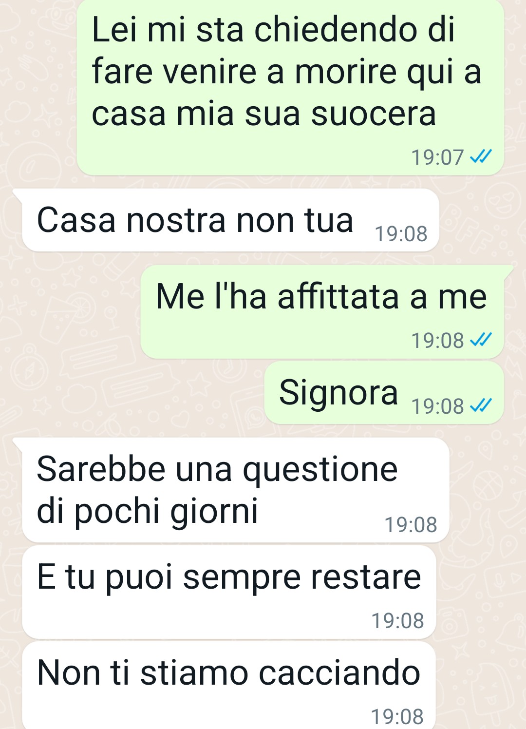 “Sono Rossella e la mia padrona di casa vuole organizzare il funerale di sua suocera a casa mia!!! Ma non solo. Mi ha chiesto anche un’altra follia! Ho preso in affitto un appartamento in centro città. Mi trovo al nono piano di uno stabile molto carino, in un residence. Ditemi voi come faccio a lasciarlo. Ho pure il posto auto dentro. La casa ve l’ho detto è molto carina e io mi trovo benissimo. Non mi sono mai piaciuti gli appartamenti ai piani bassi. La mia padrona di casa vuole fare venire sua suocera A CASA MIA e poi vuole farle il funerale a tempo debito qua, cioè la veglia con tutti i parenti!!!! Io non so se accettare in fondo qua ci sono due stanze da letto e loro penserebbero a tutto. Solo che la signora mi sta chiedendo anche un’altra cosa. E io non so se acconsentendo pure a quest’altra follia io mi ritroverò ancora più incasinata, ancora più nei guai. Non mi fido più della signora che mi sembra una grande approfittatrice e manco una brava nuora nei confronti di sua suocera. Ma questi non sono fatti miei.”