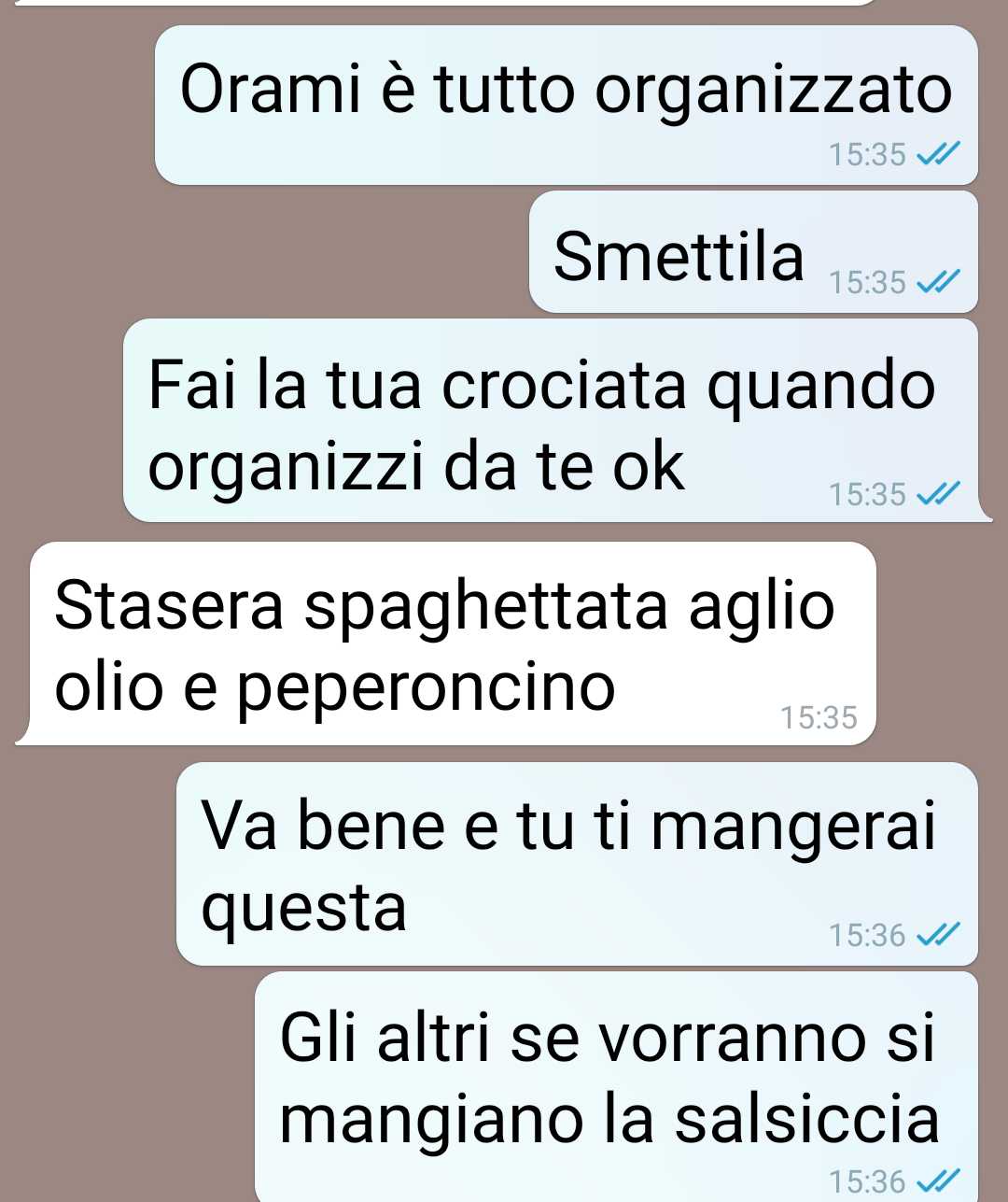 Negli ultimi tempi però, qualcosa è cambiato. La sua ragazza ha deciso di voler diventare vegana e, come racconta, non si è limitata a scegliere per sé, ma ha iniziato a imporre le proprie convinzioni anche agli altri. Descrive la sua determinazione come una vera e propria forma di militanza: per lei ogni discussione diventa una battaglia e ogni divergenza un affronto personale.