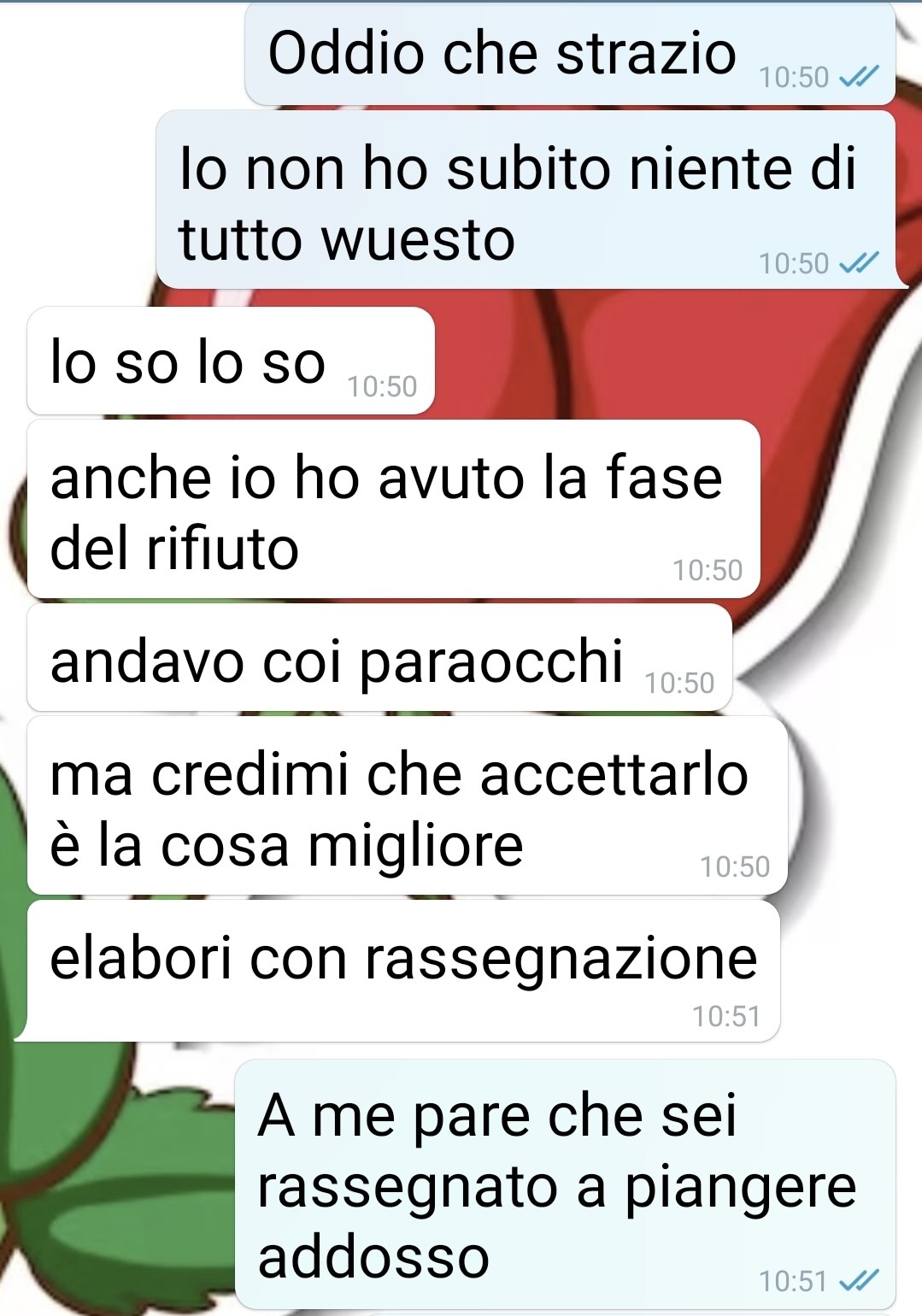 Il ragazzo si mostra improvvisamente triste, introspettivo, frustrato e, a detta della nostra fan, anche eccessivamente bisognoso di comprensione e conforto, tanto da voler consolare lei per una situazione che non ha mai rappresentato un problema.